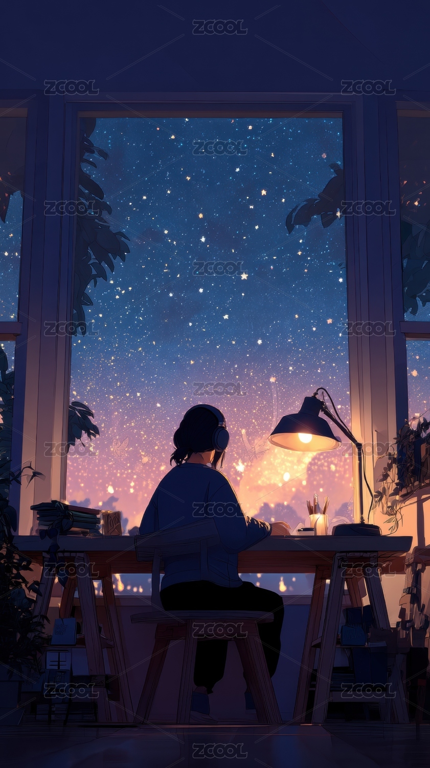 窗边夜读星河图