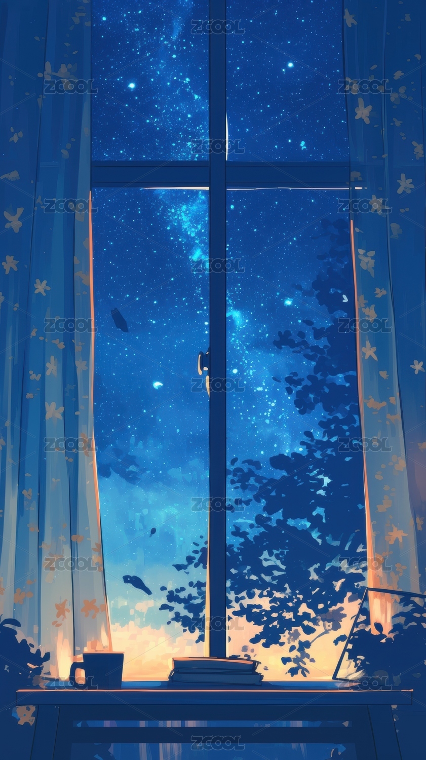 窗前夜景星空与树影交织
