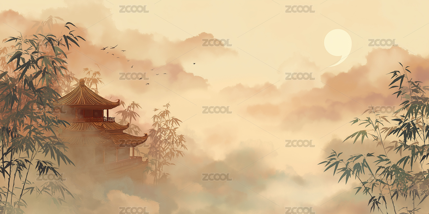 中国风,中国画,蓝色,写意,意境,亭子,阁楼,风景,留白,树木