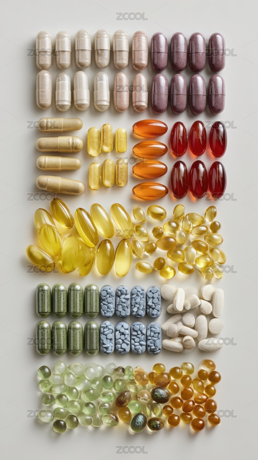 俯视不同颜色形状的药丸和胶囊规整放在桌面