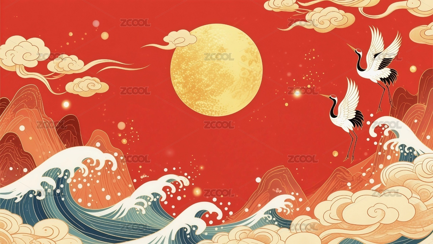 蓝色大海上翱翔的两只仙鹤中国风插画