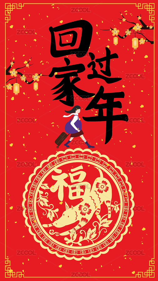 回家过年春节牡丹锦鲤开运赐福矢量插画海报