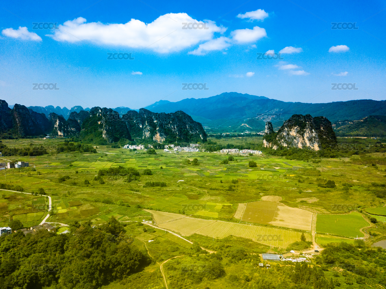 秋天阳光下喀斯特山峰间的村庄和金色的稻田