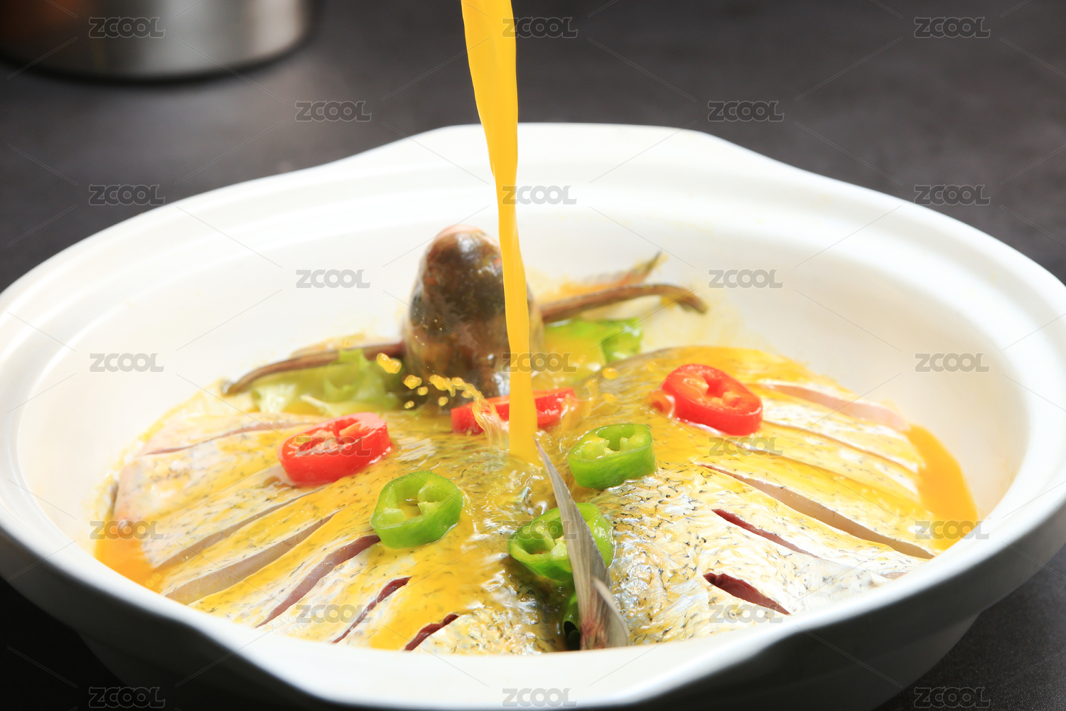 深色背景上白色汤锅里的武昌鱼,上面有着青