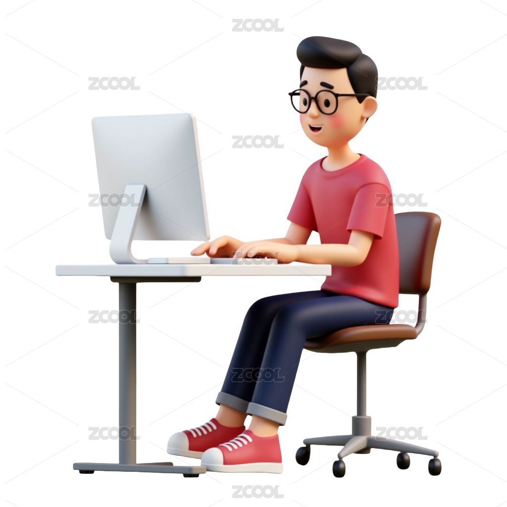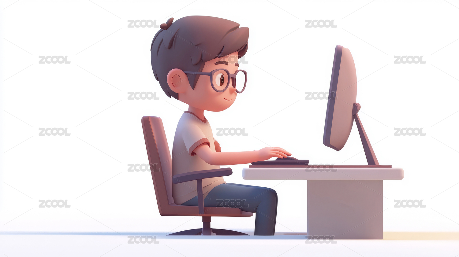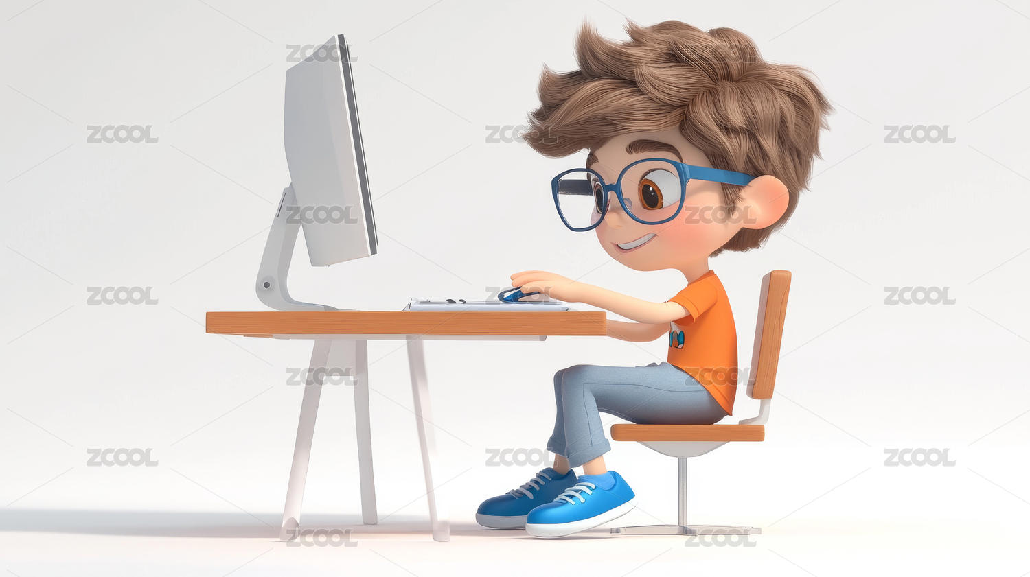 3D卡通风格坐在桌前微笑使用电脑的儿童