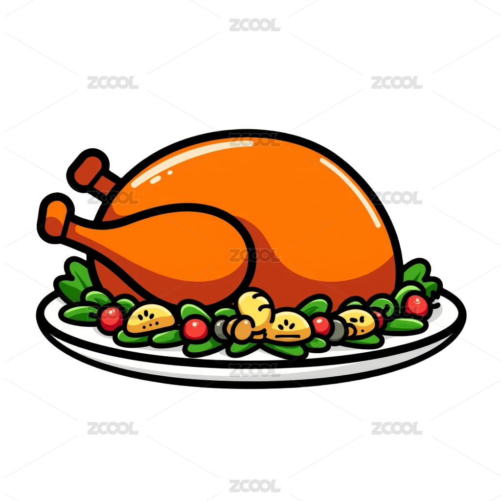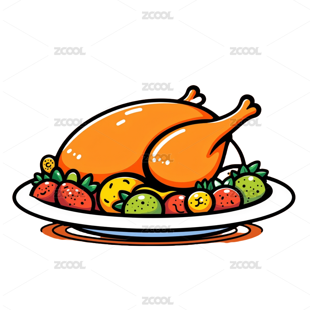 白色盘子上的烤鸡插画