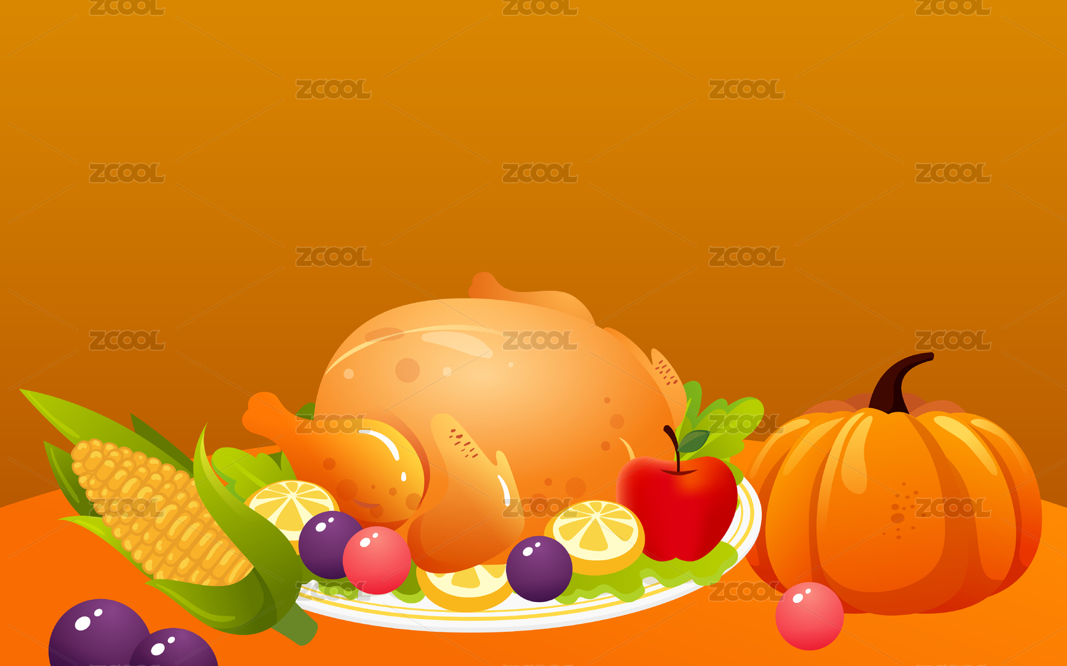 火鸡和水果,感恩节美食矢量插画