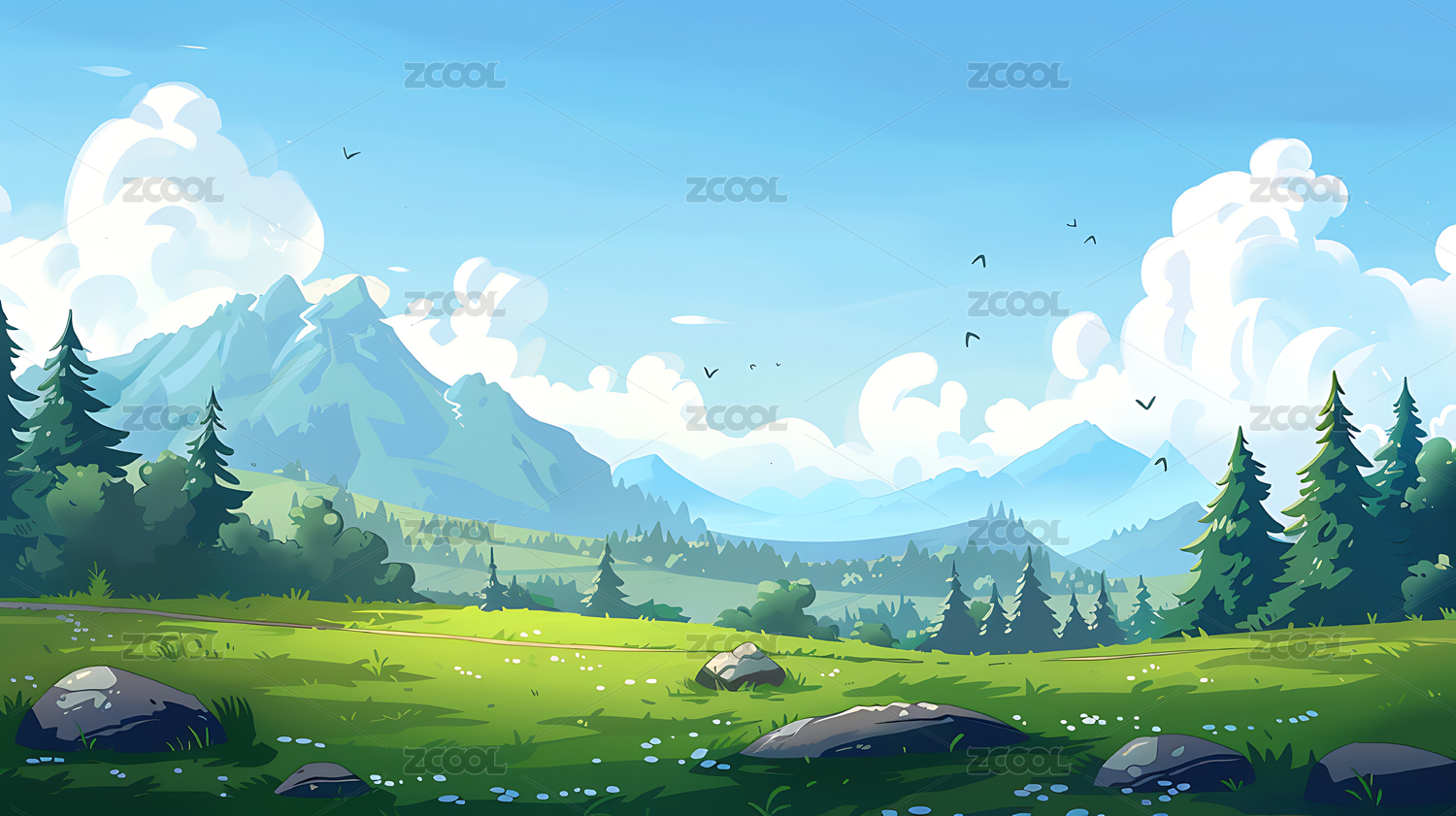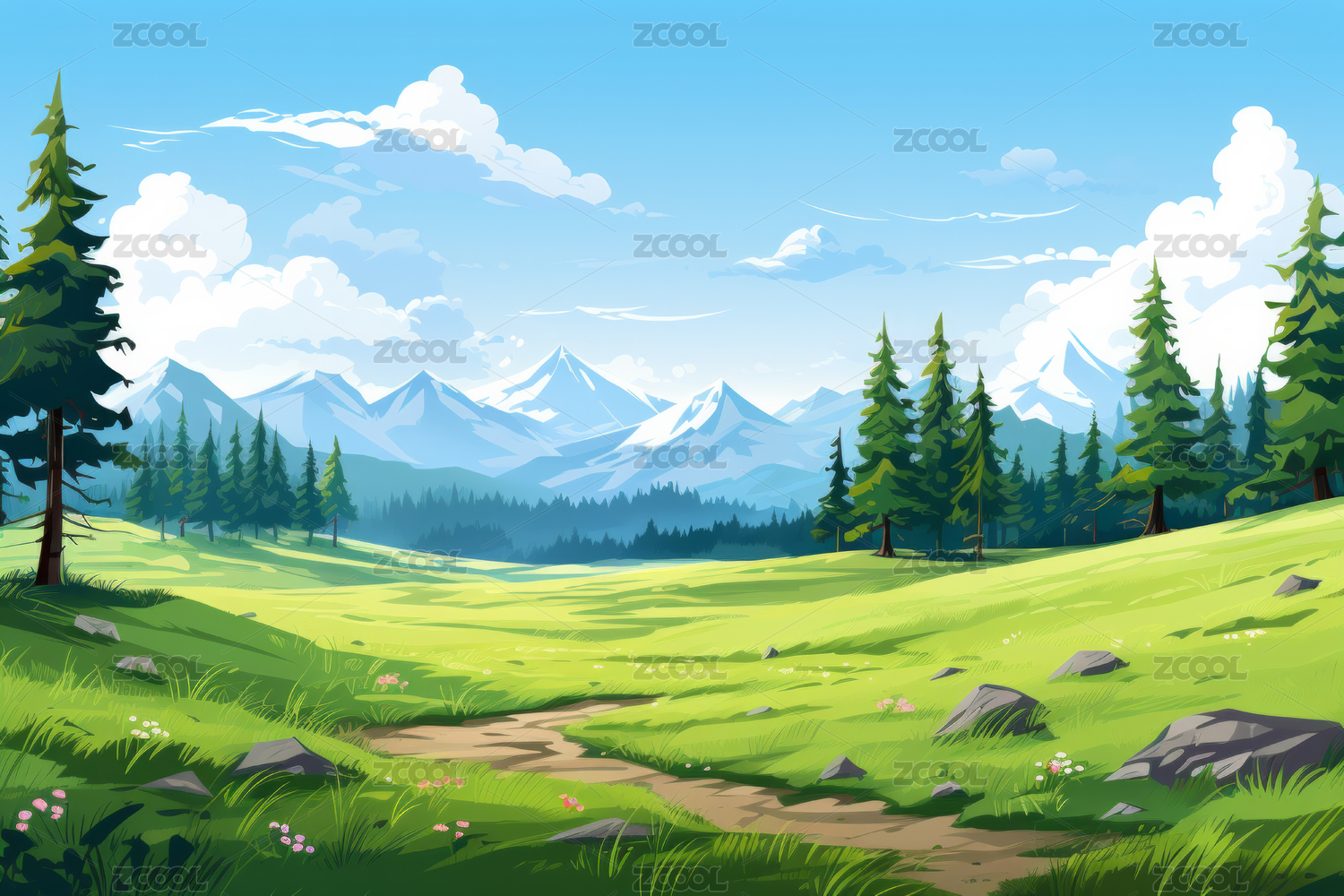 宁静,自然,风景,插图,阳光,山脉,森林,绿色,草地,白色