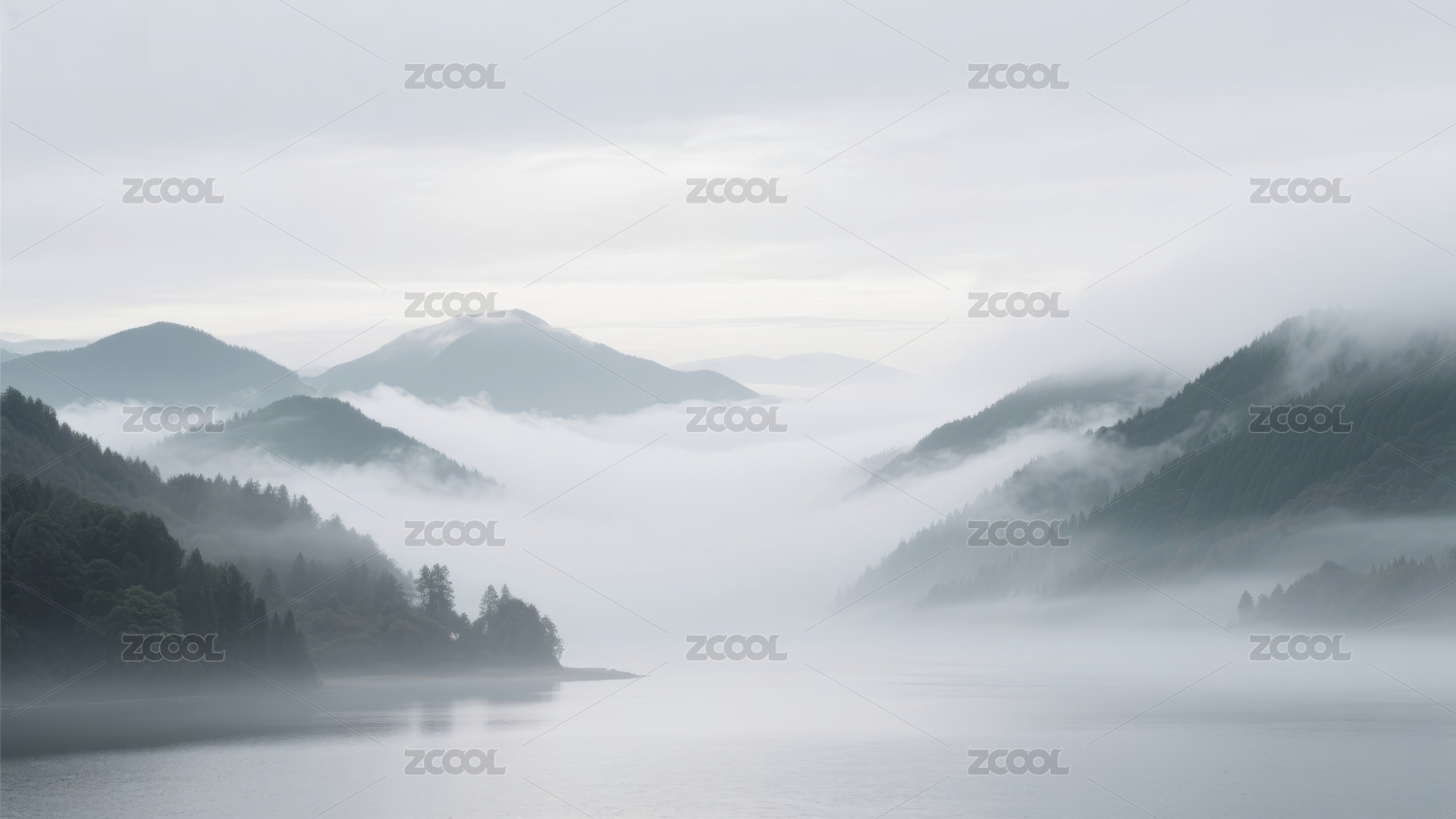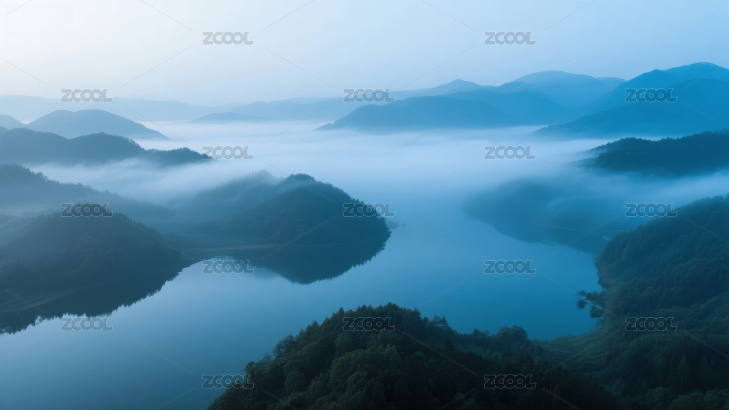 中国安徽省宣城泾县桃花潭风景区清晨江面薄雾飘渺的美景