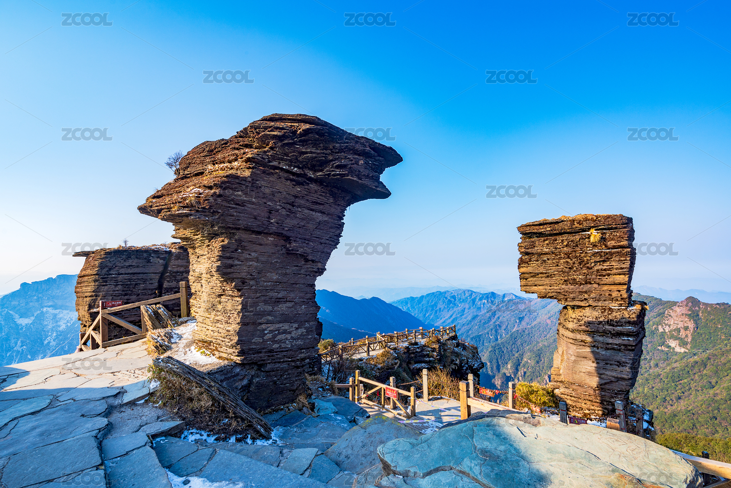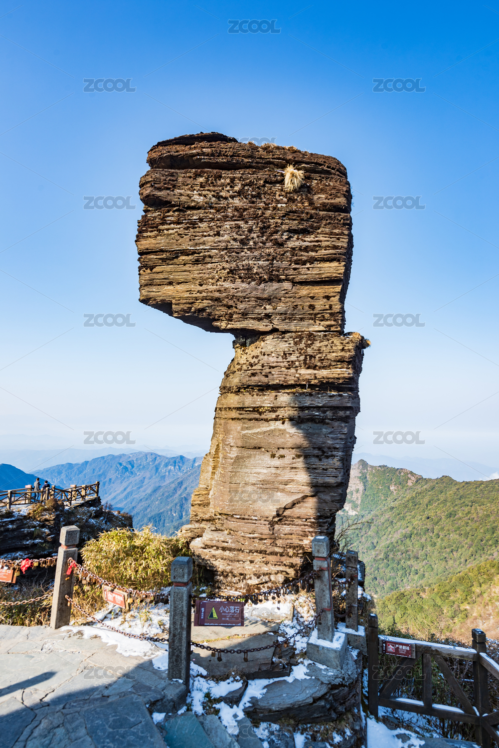 贵州铜仁梵净山冬季晴天下的蘑菇石