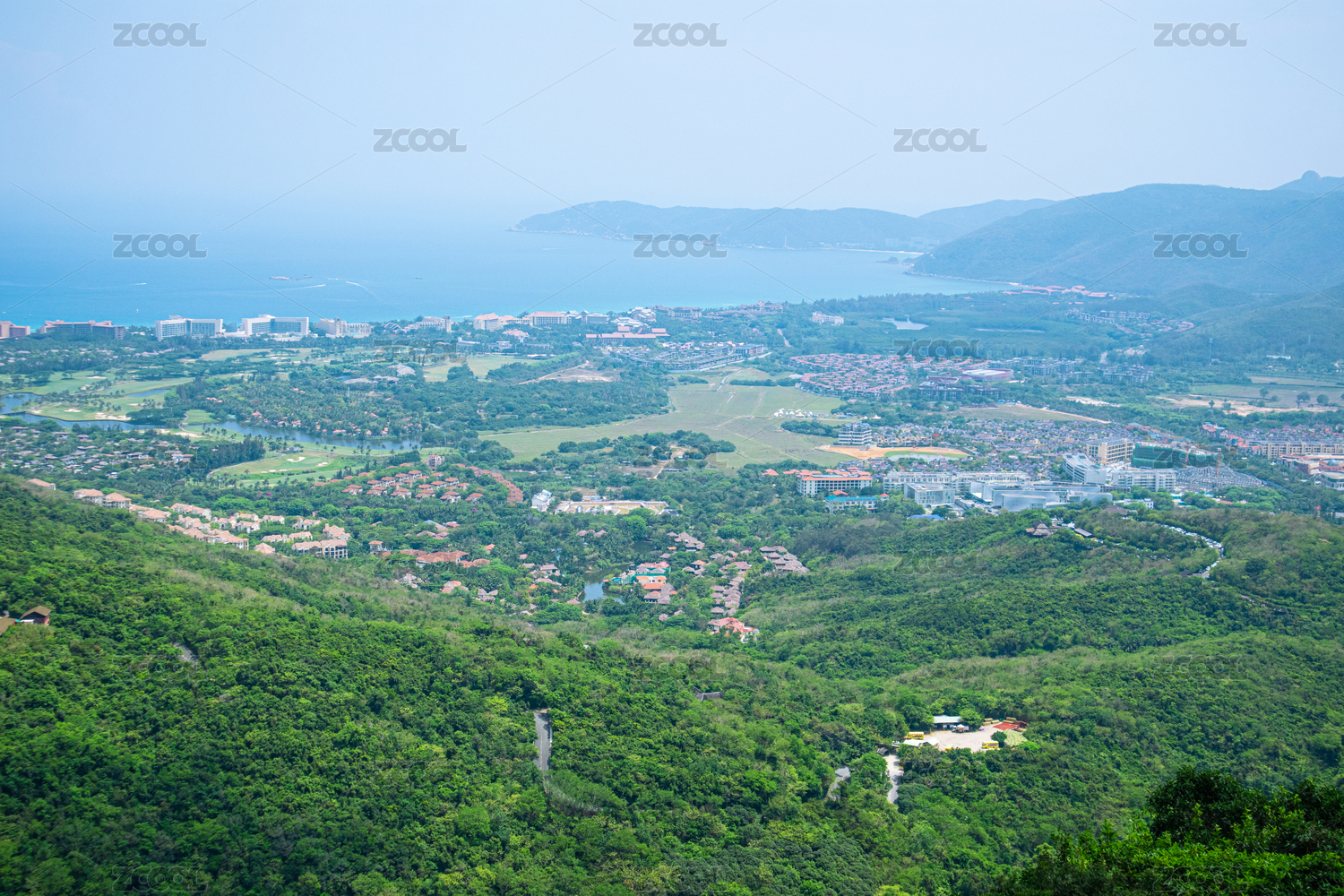 海南凤凰岭山顶俯瞰海岸海湾城市建筑群
