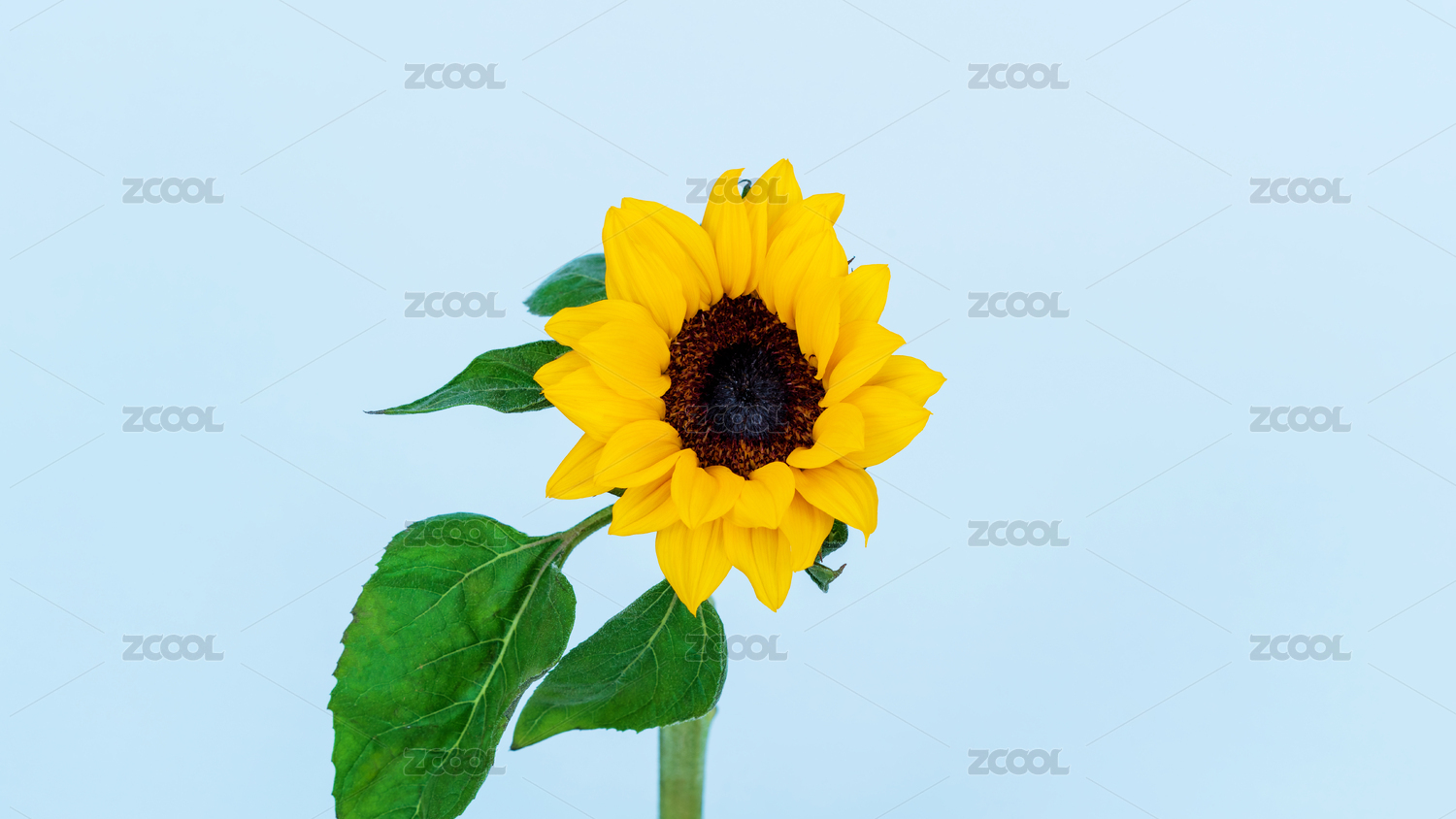 晴天户外仰拍带绿色叶子的黄色的向日葵