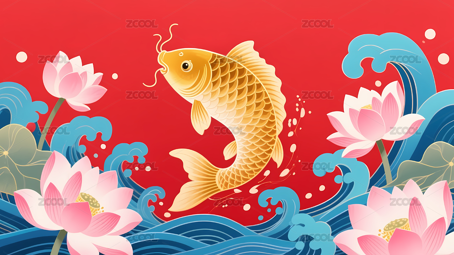 红色,扁平化设计,传统,庆祝,国风,文化,海浪,无人,锦鲤,国潮风