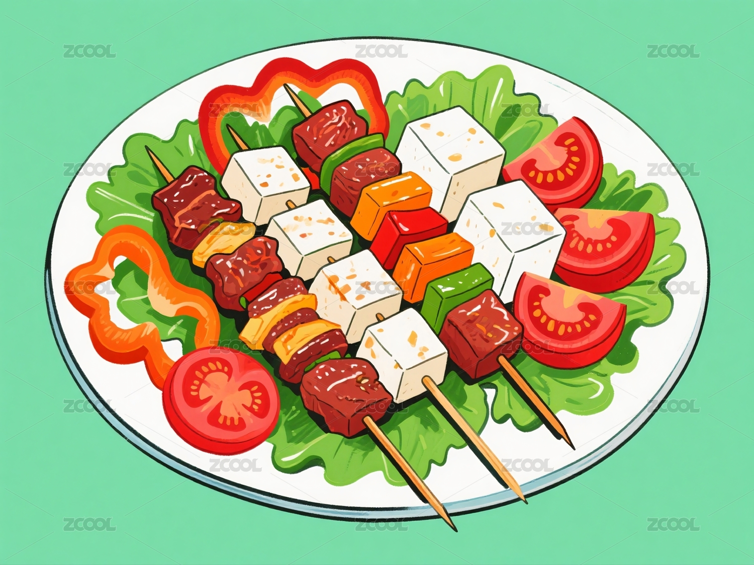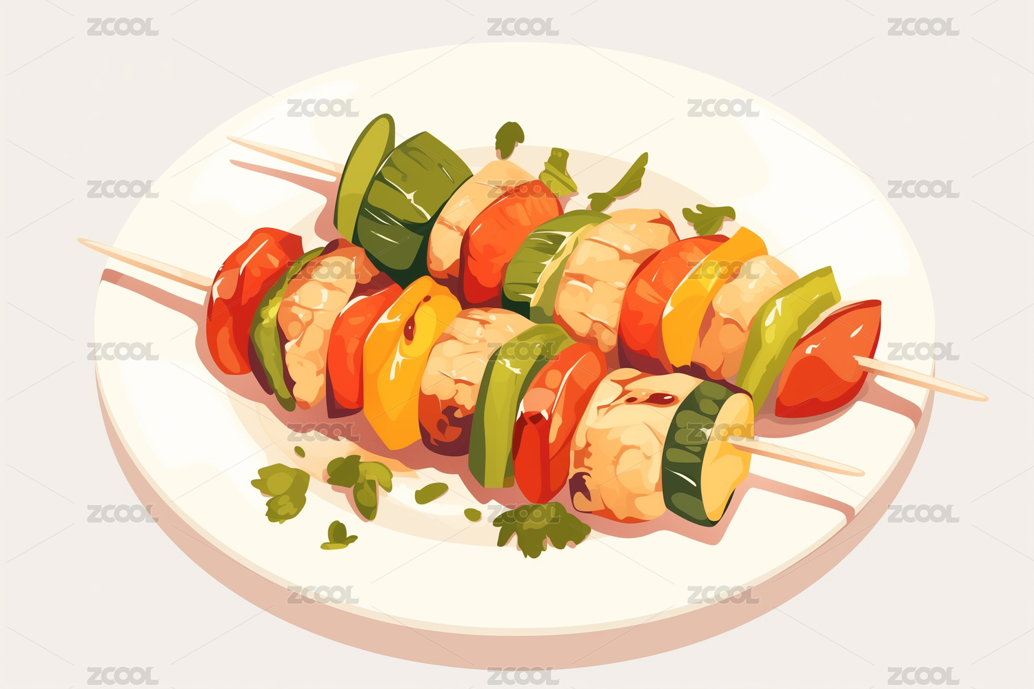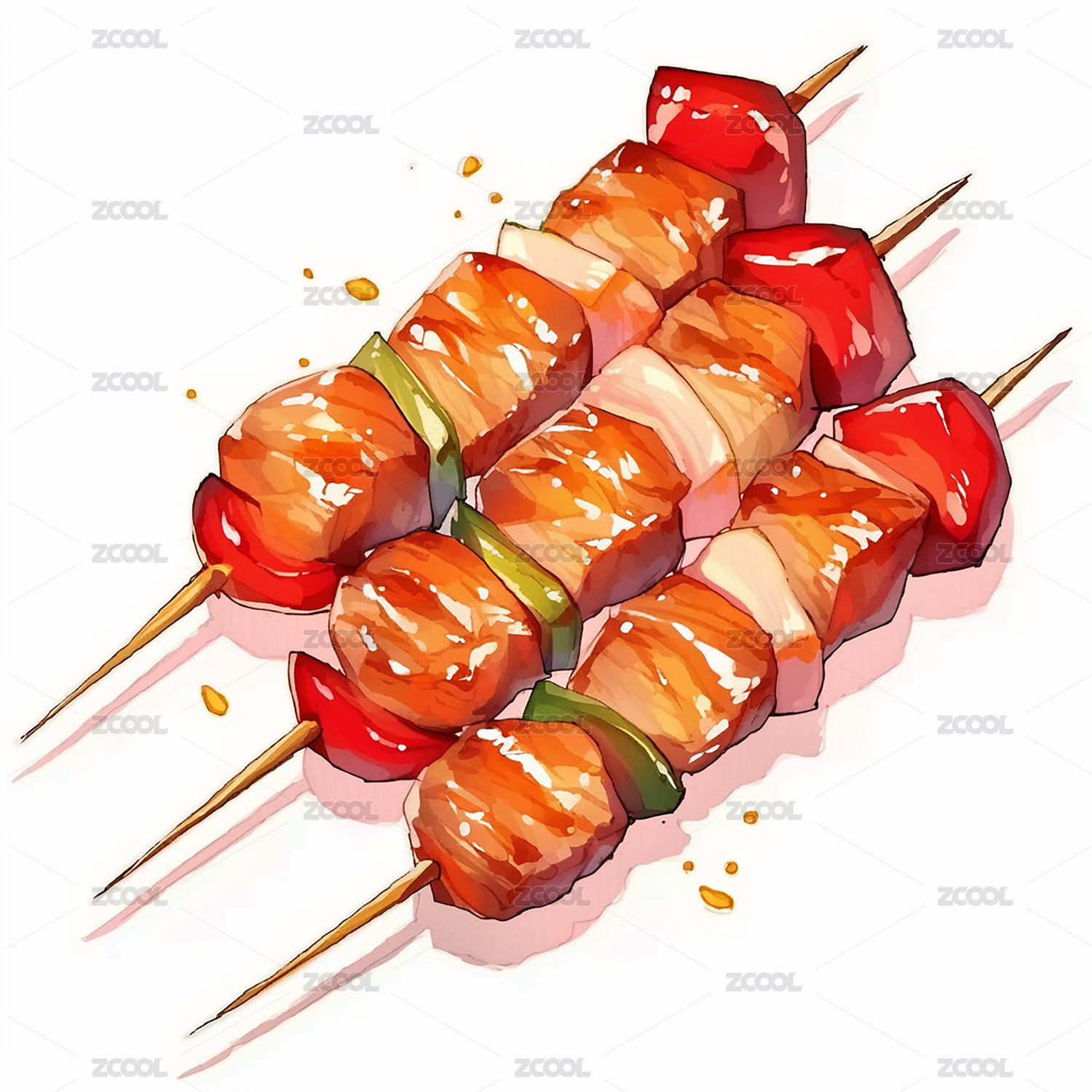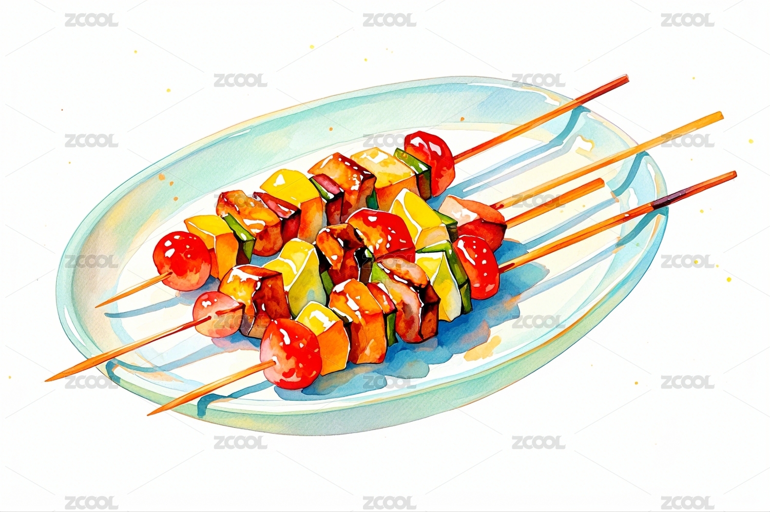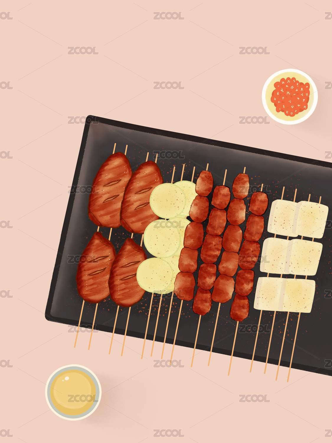 桌面盘中的烤串炸串肉串涮串插画绘画手绘