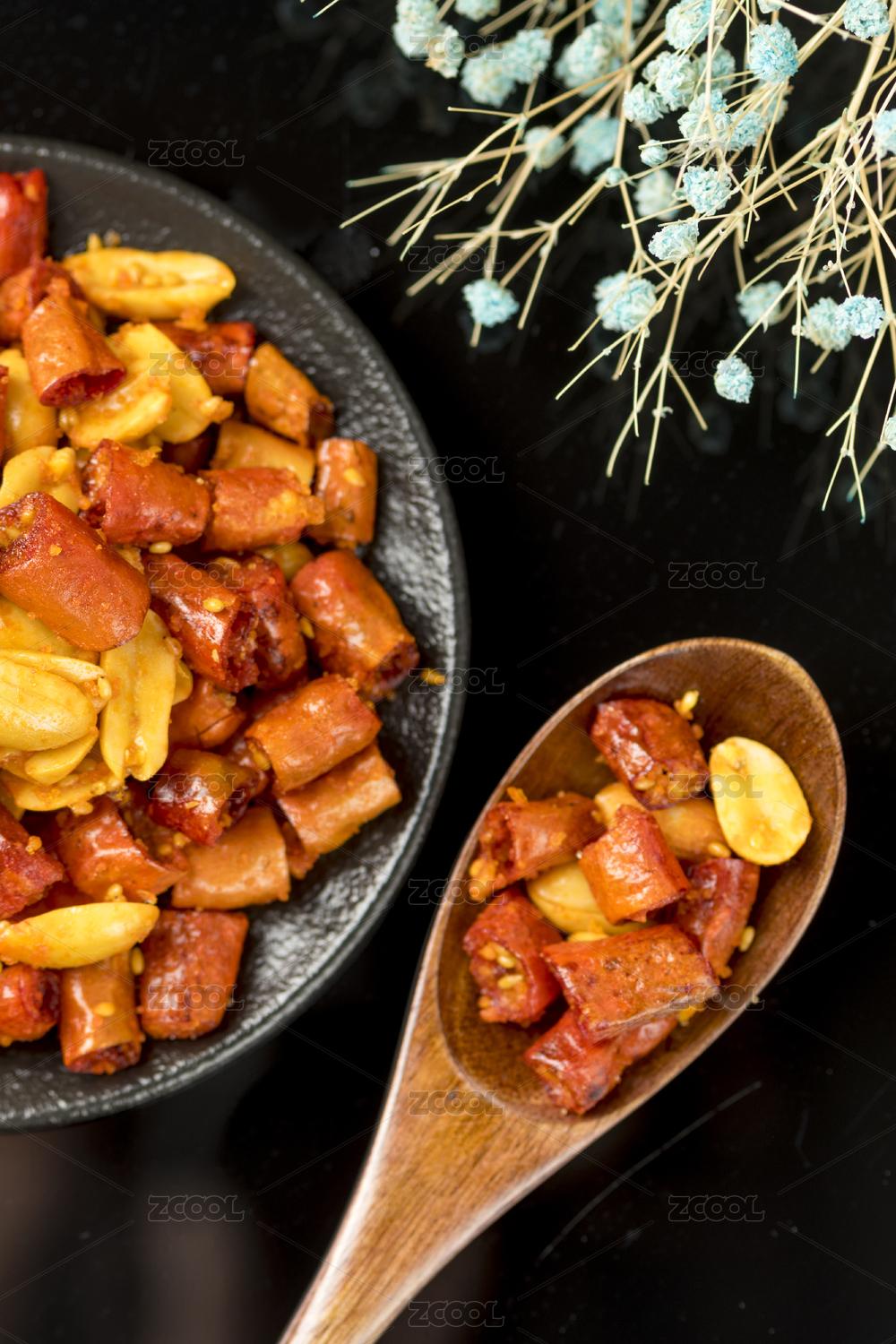 白芝麻,油炸鸡腿肉块,木盘子,黑石板,木勺子,散落的,调料粉,鸡胗子,肉块,油炸