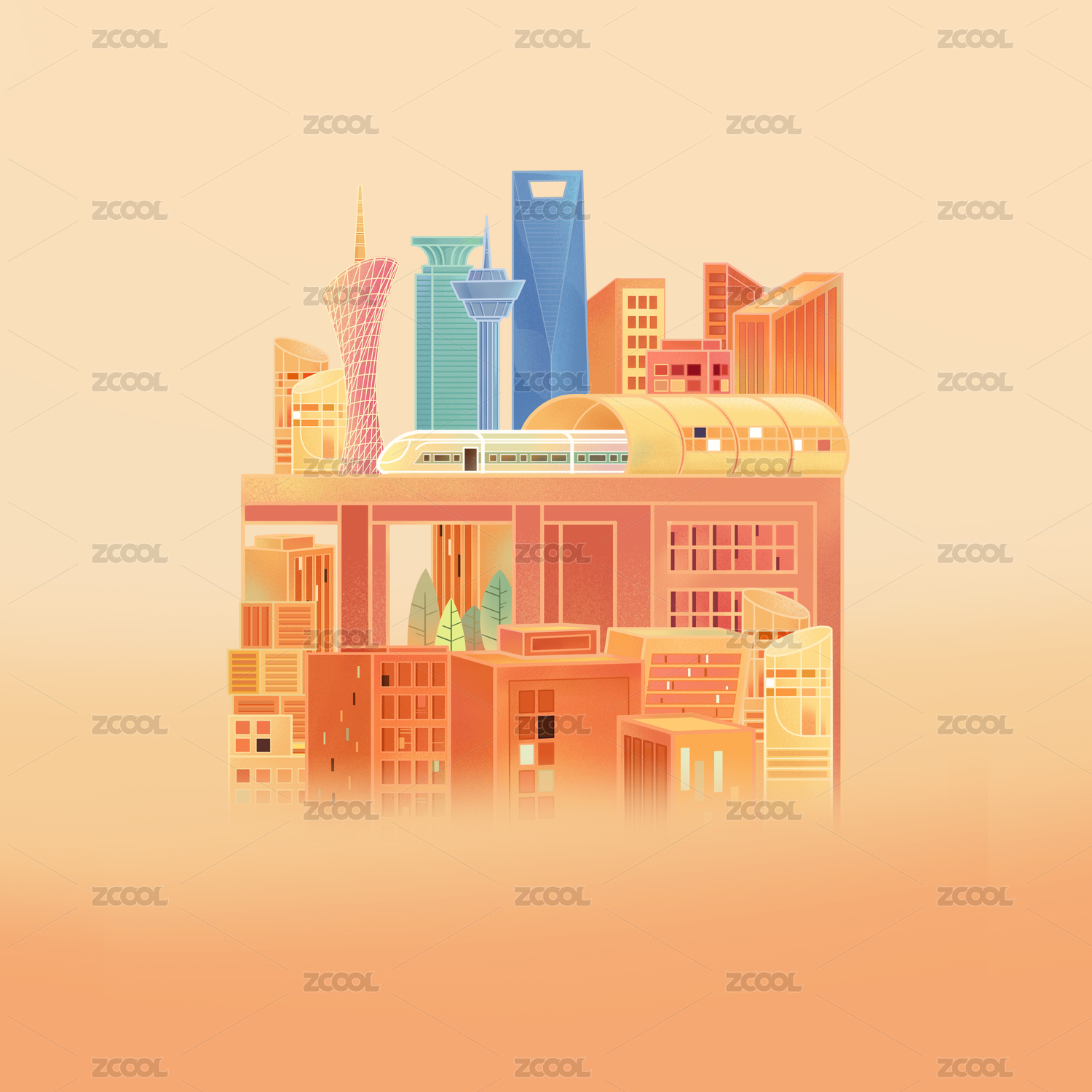 中国国潮城市建筑扁平插画