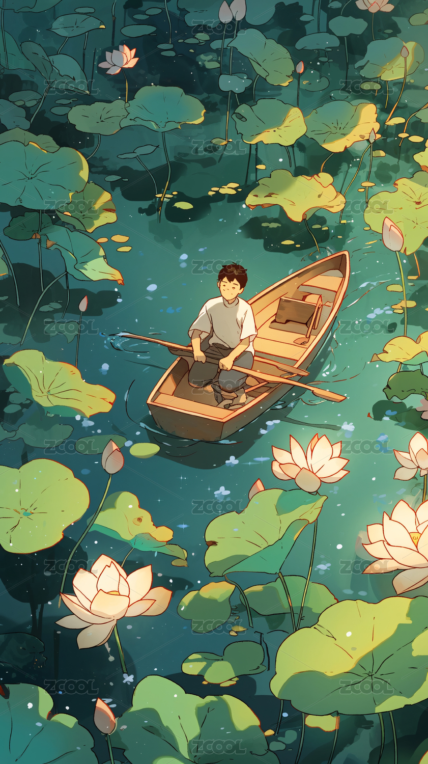 夏天立夏一个小孩在荷花池中划船唯美插画