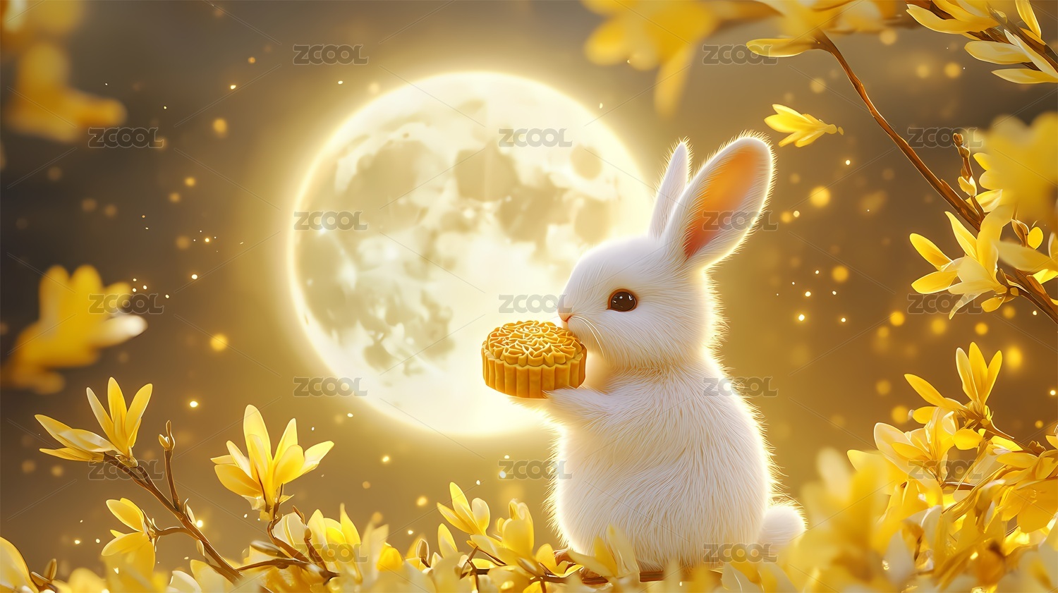梦幻中秋节夜晚圆圆的月亮兔子抱着月饼