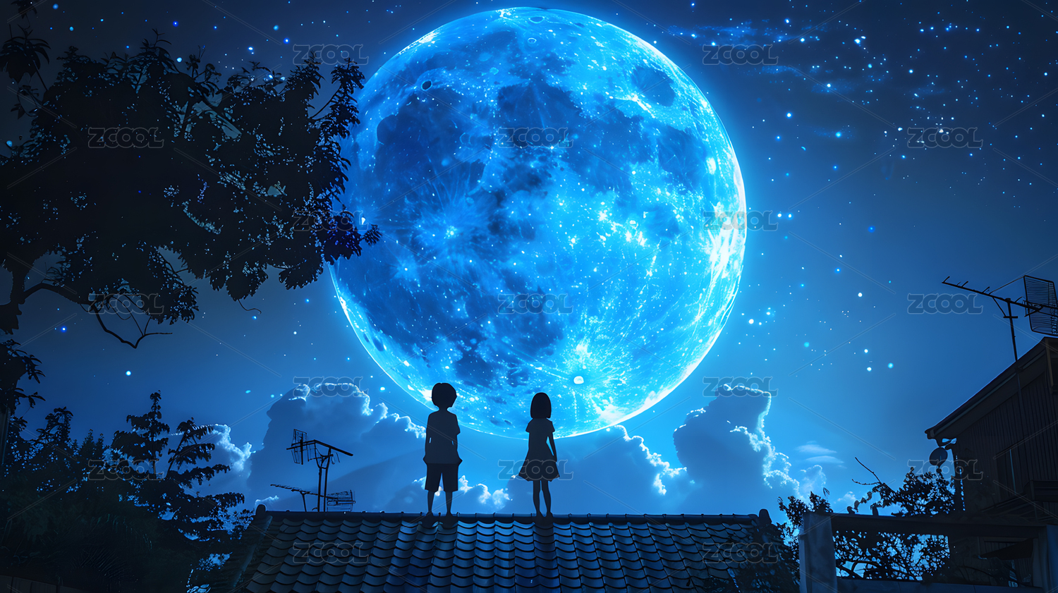 屋顶上坐着的孩子背影,看着夜空的月亮