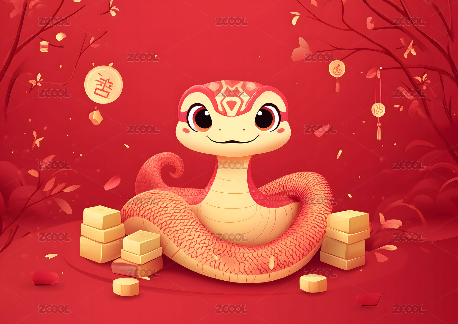 中式蛇年盘旋在金币上的蛇春节素材