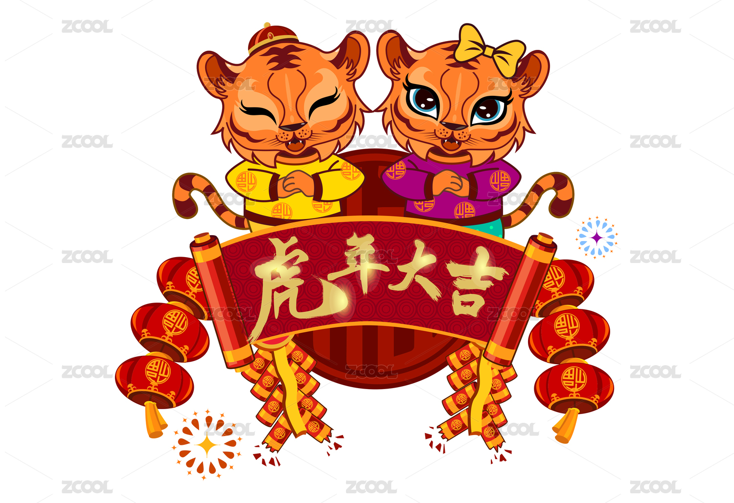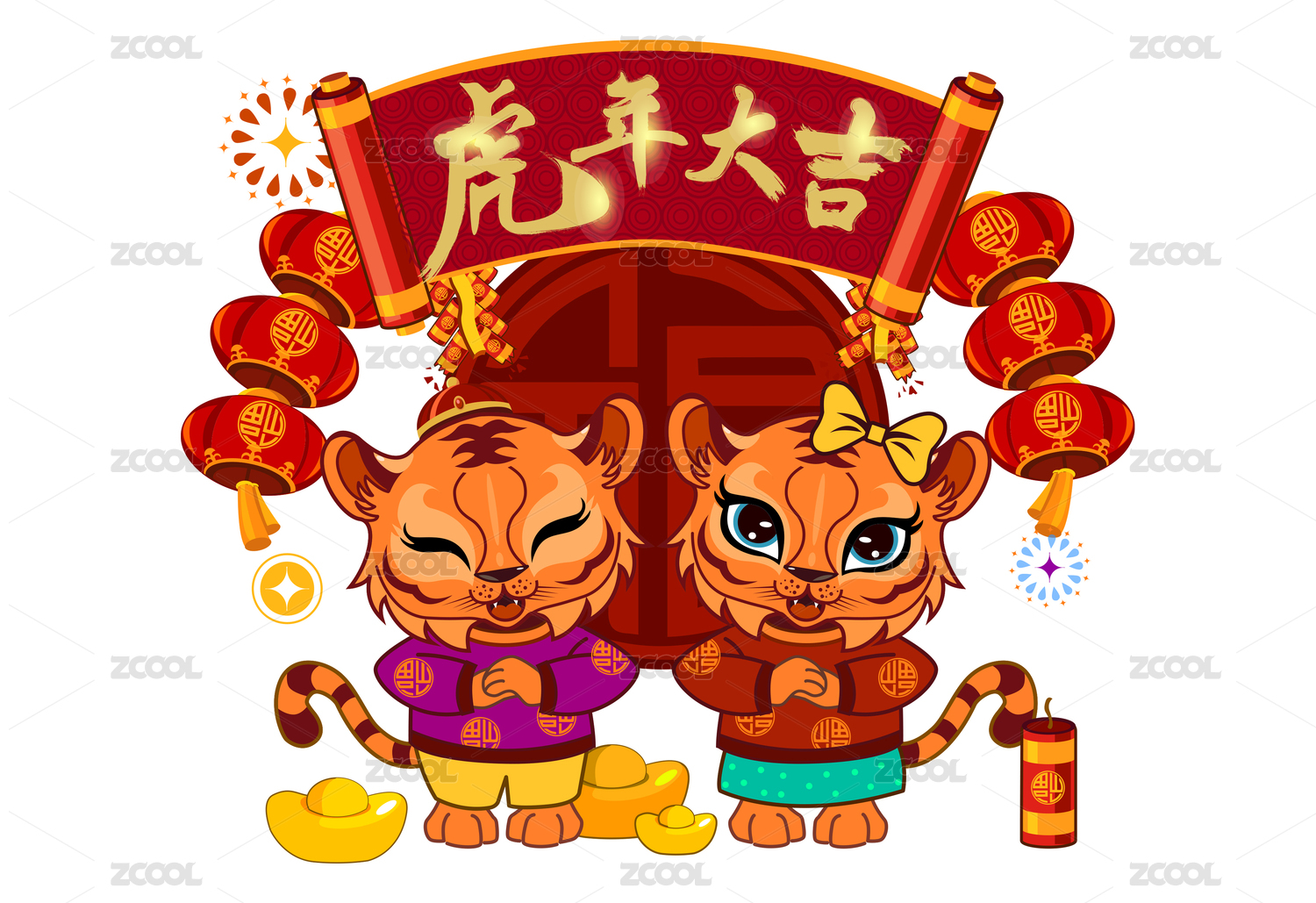 国潮新年春节虎年可爱拜年情侣老虎元素