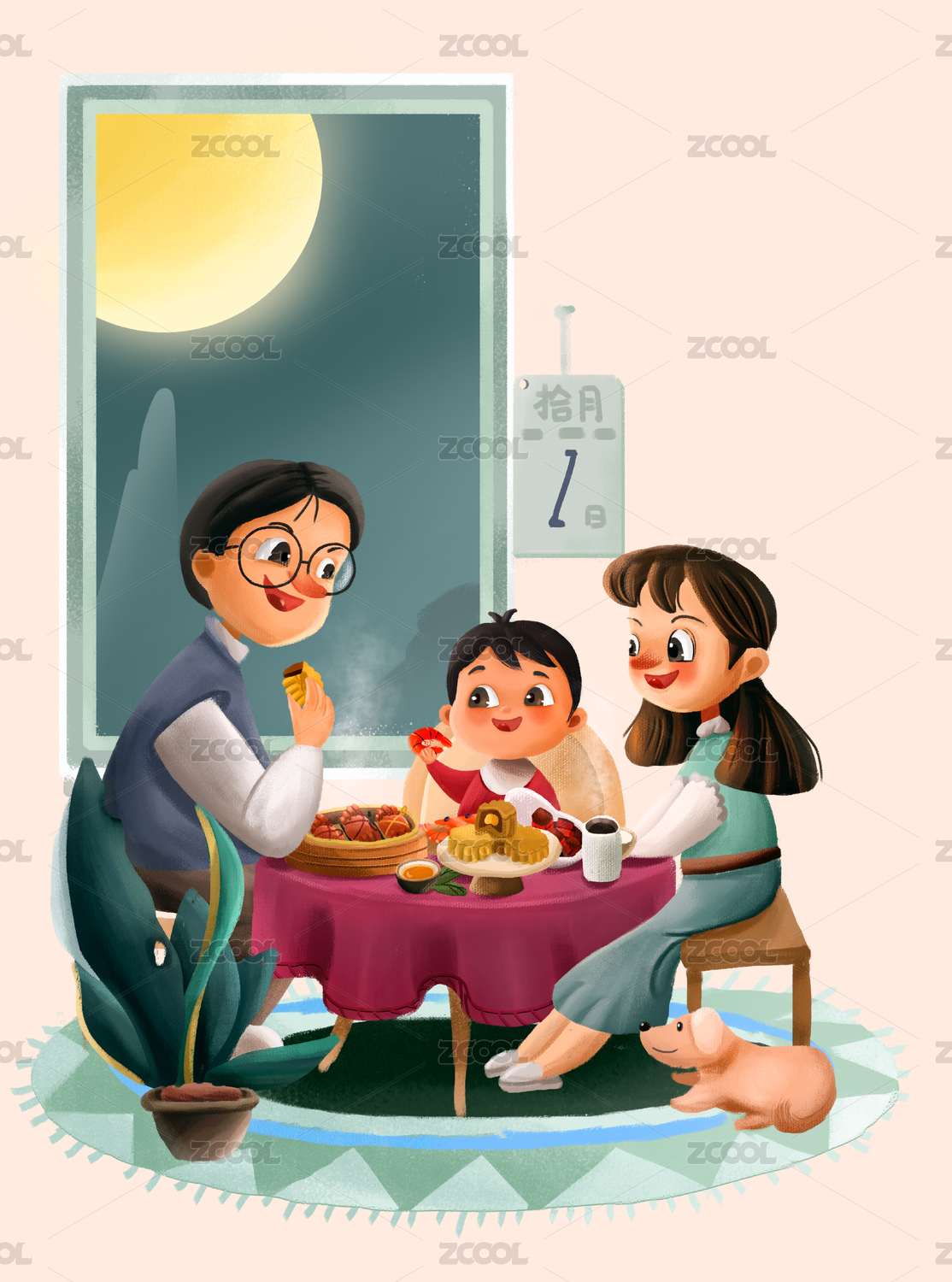 中秋节一家人吃团圆饭赏月吃饭聚餐美食插画