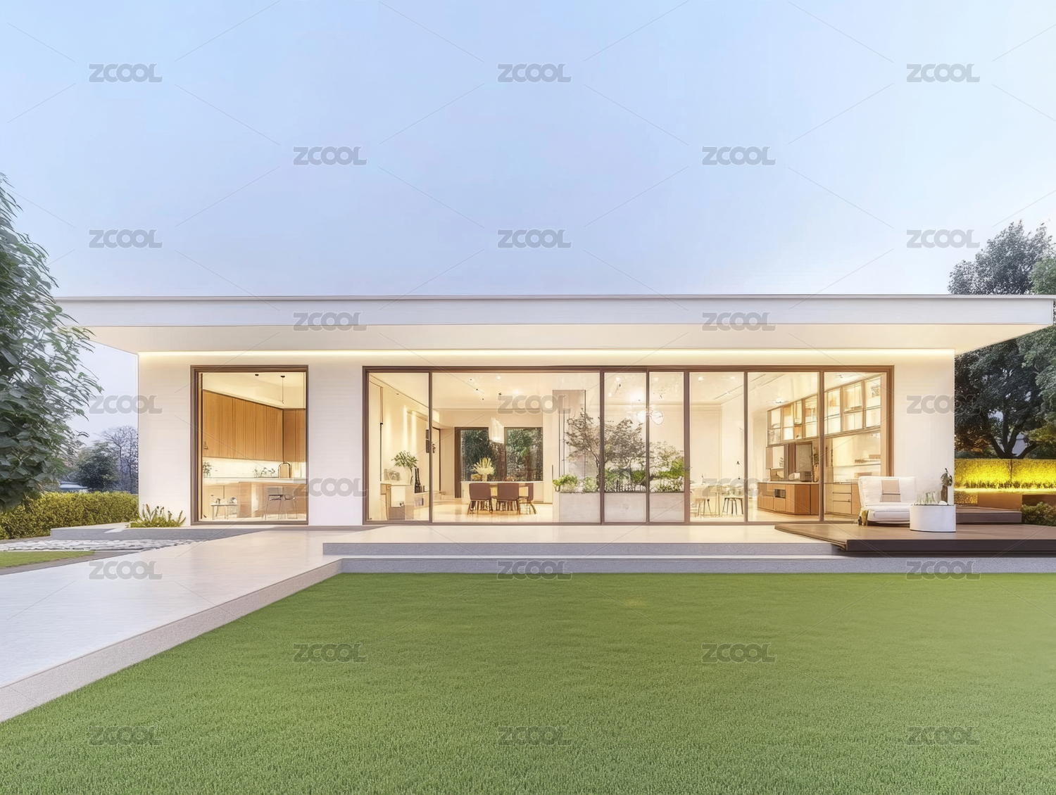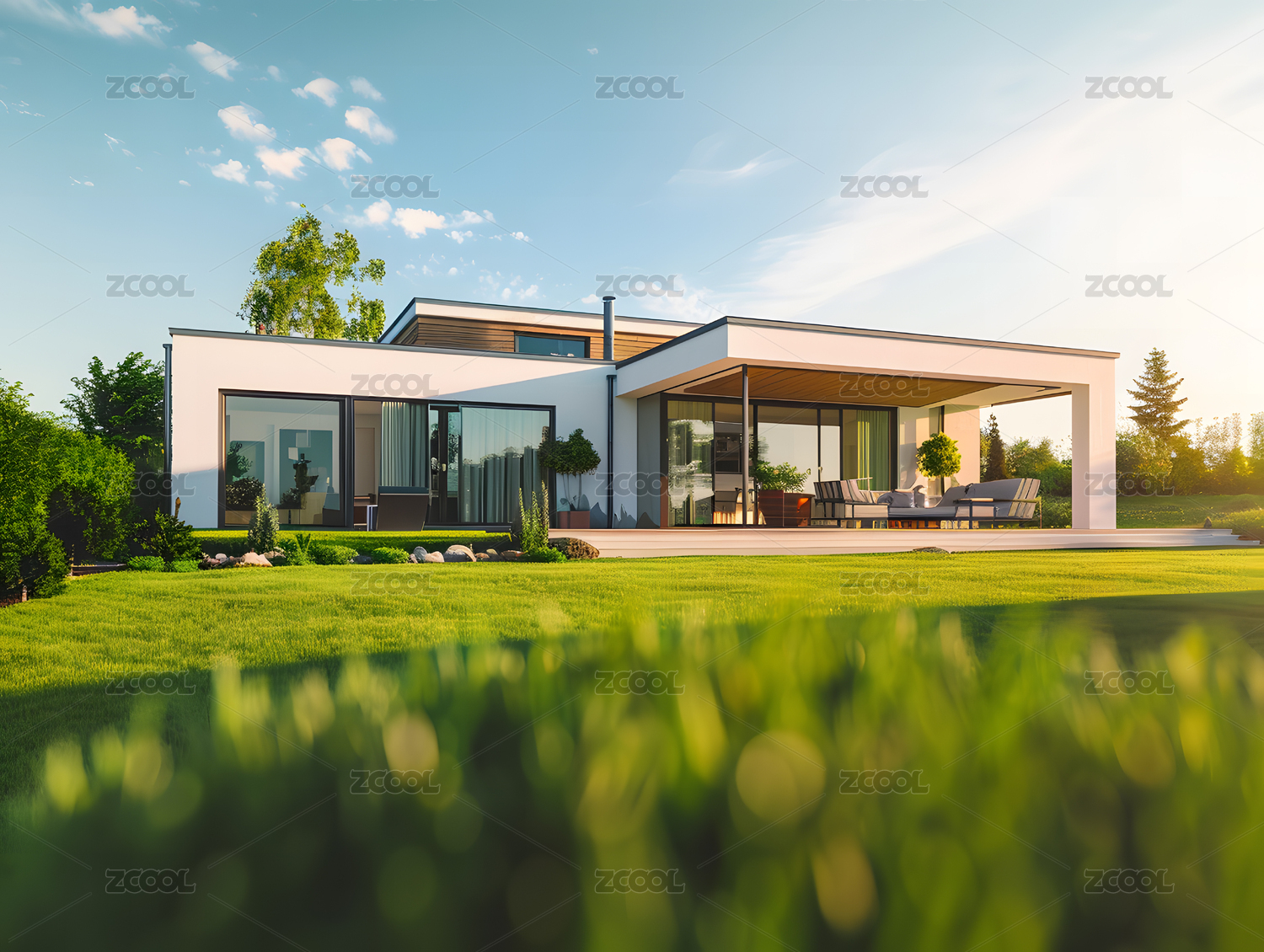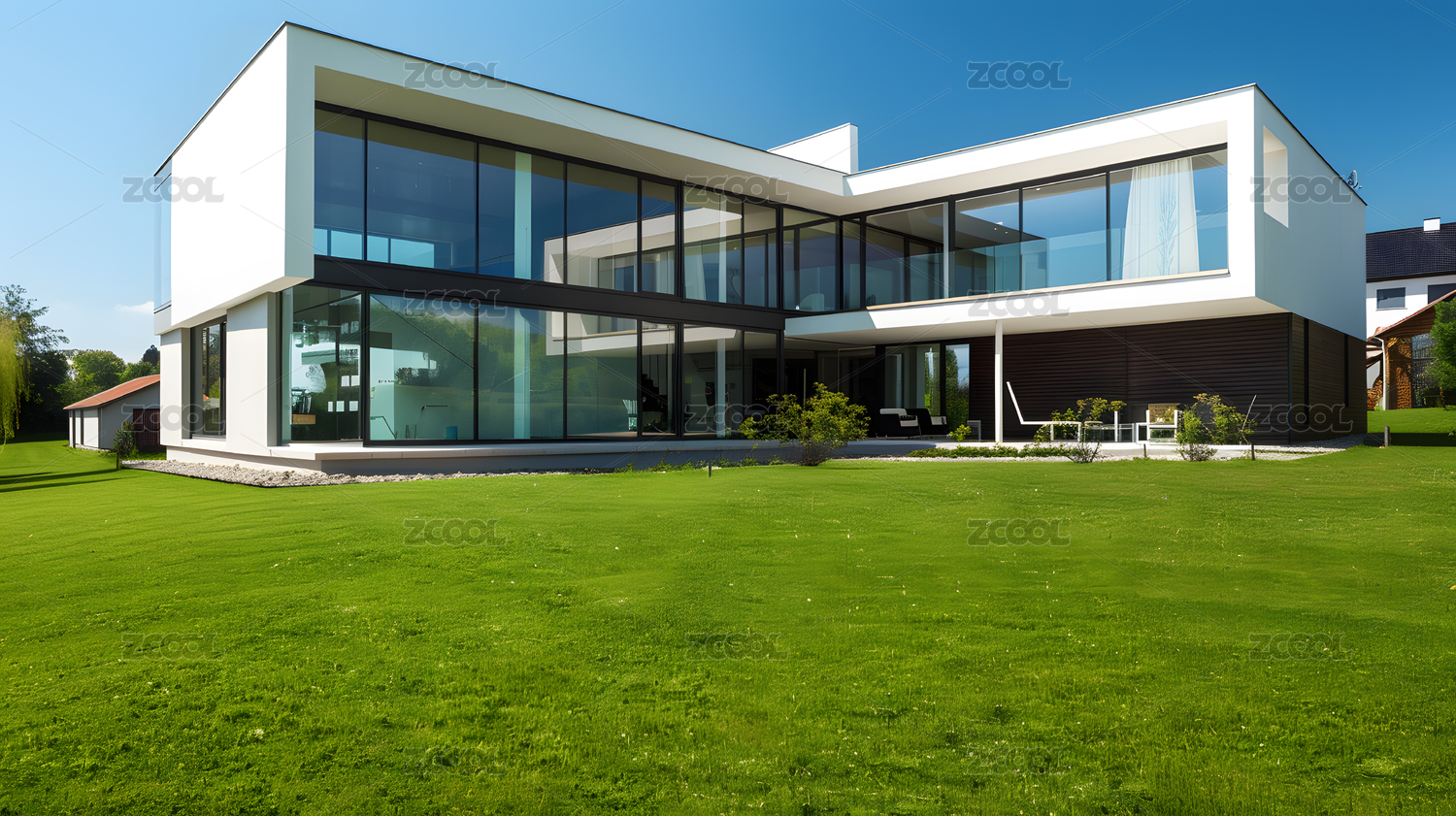 现代简约别墅前的草地空间背景