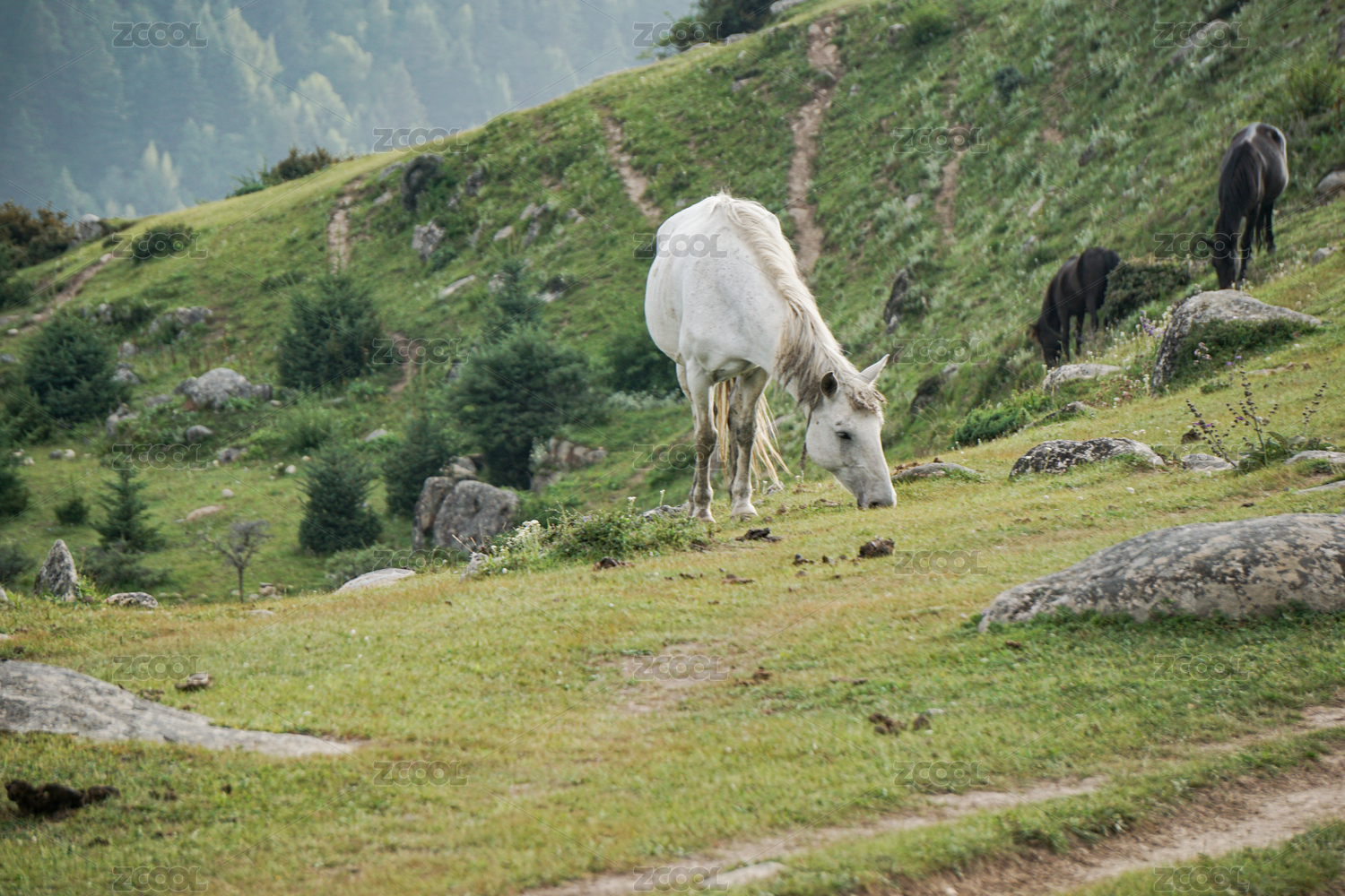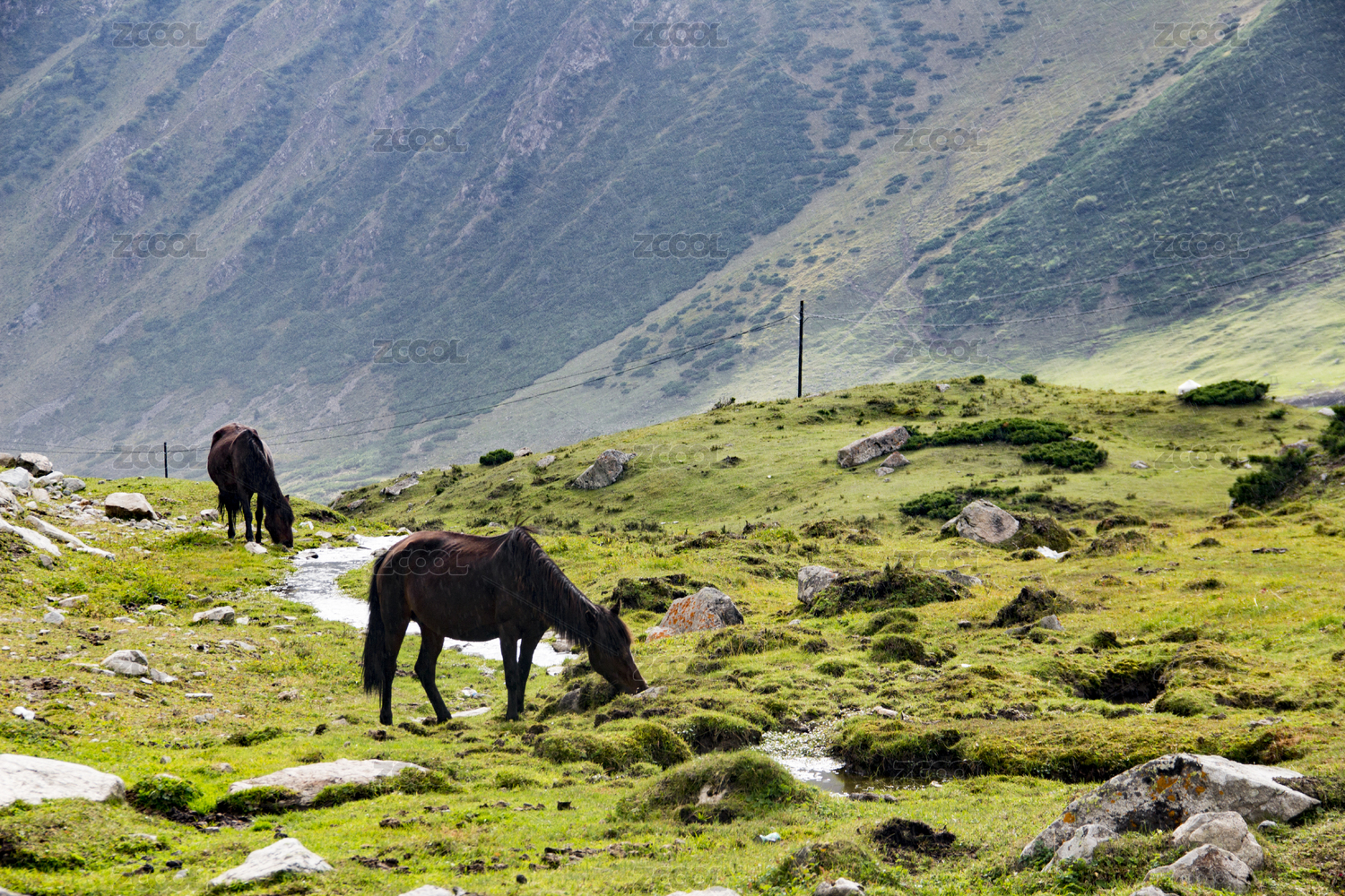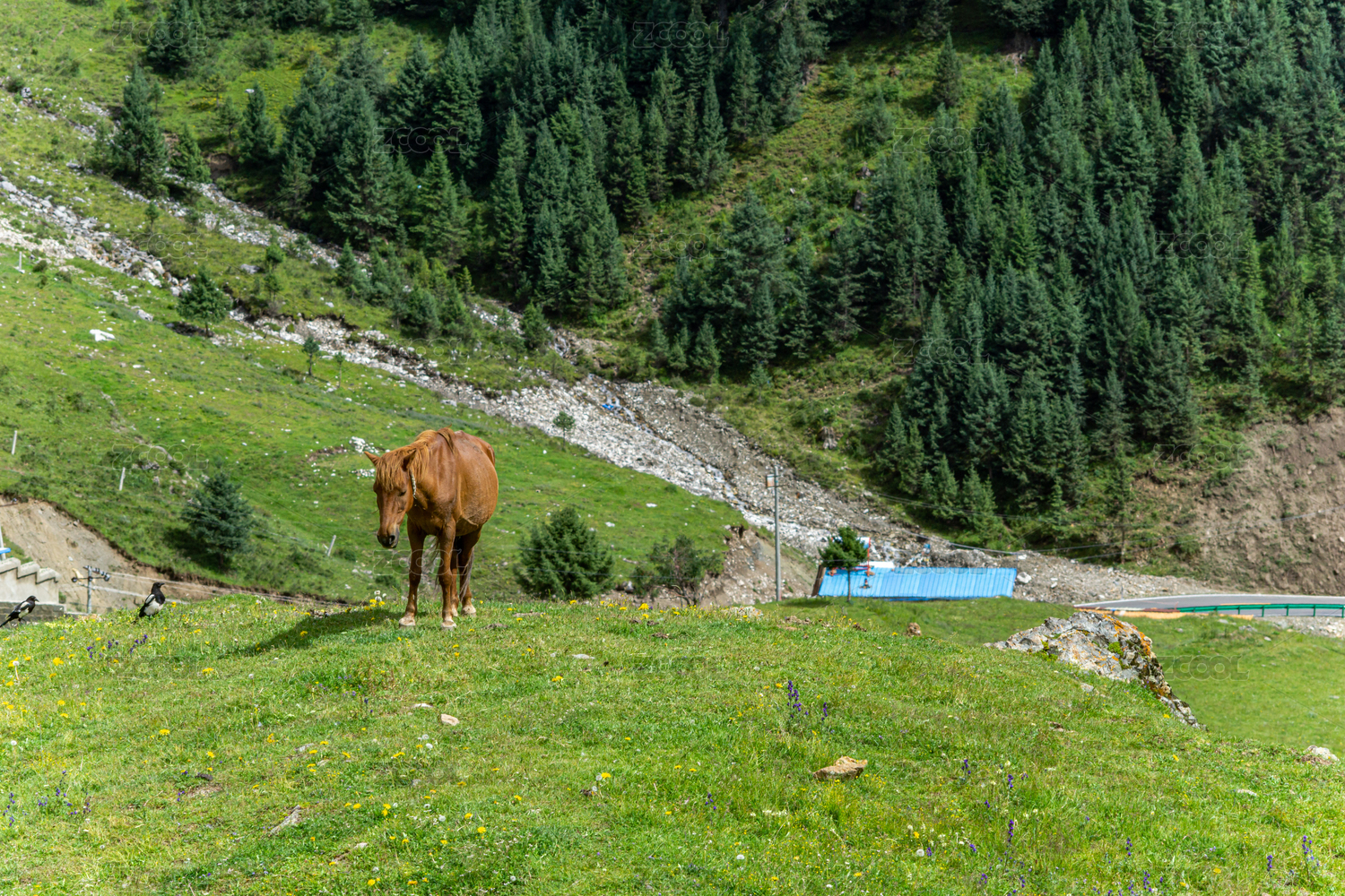 甘孜县曲洛色依山沟吉山吃草的马匹