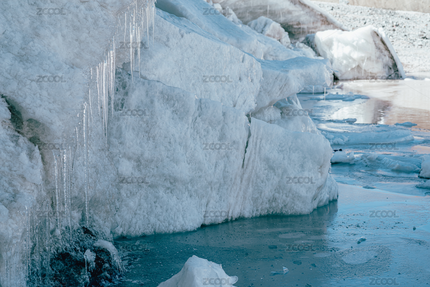 冬天的湖面上被冻住的冰凌