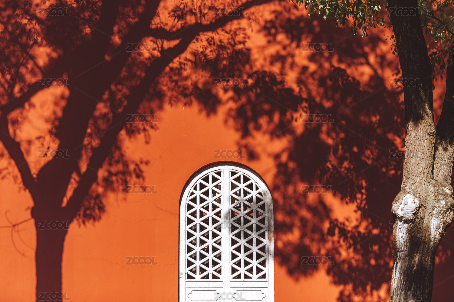 江苏南京鼓楼公园传统建筑红墙上的光影