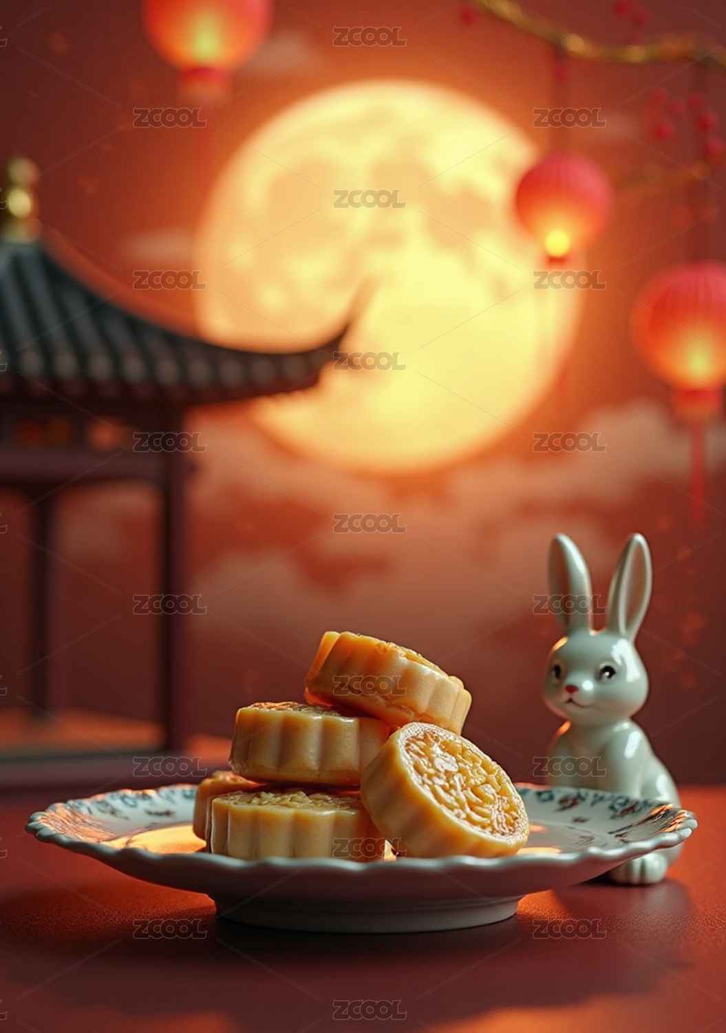 传统中秋节奔跑的3D兔子在月饼上跳跃