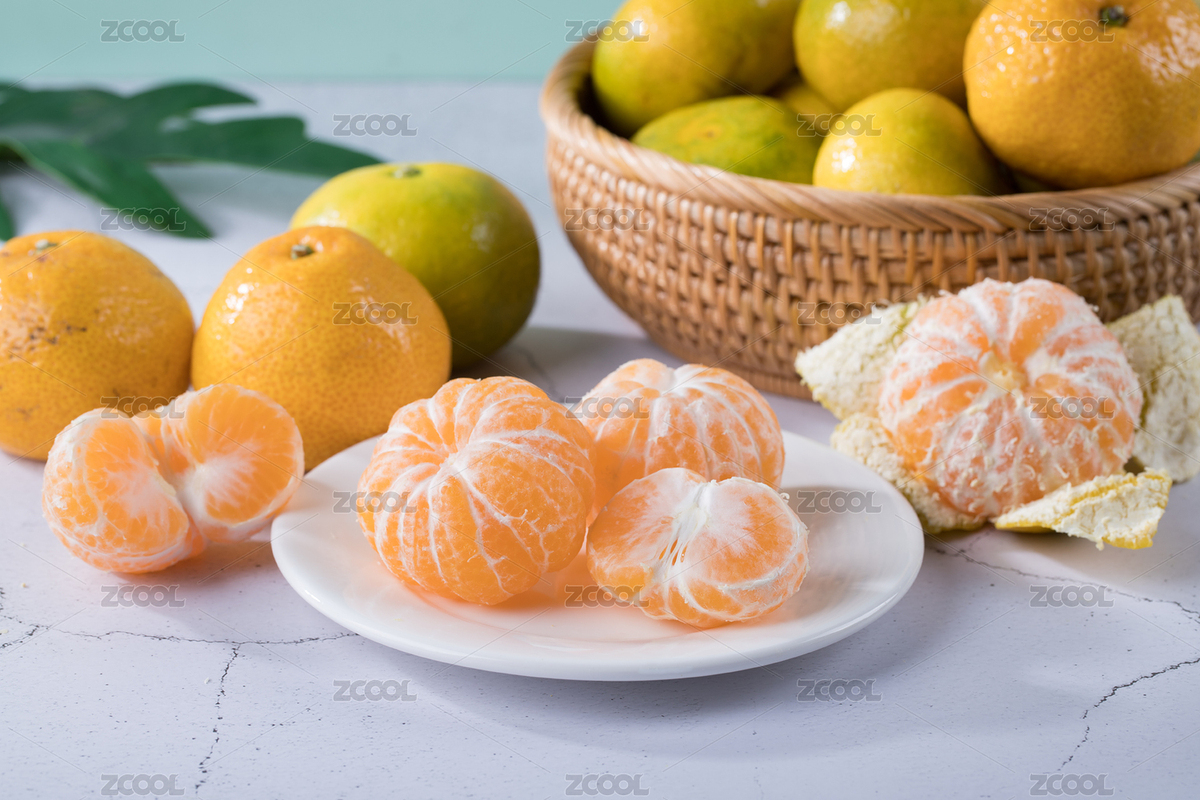 一颗拨开皮的砂糖桔靠在新鲜砂糖桔上