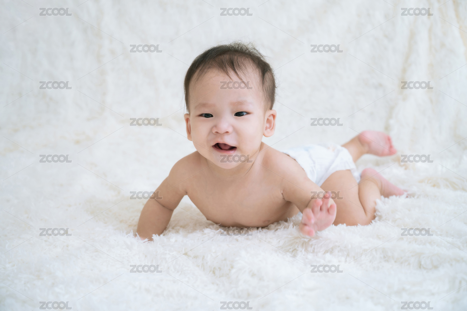 穿着纸尿裤趴在白色床上的一个新生儿宝宝