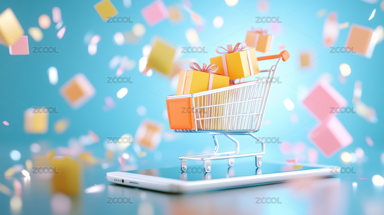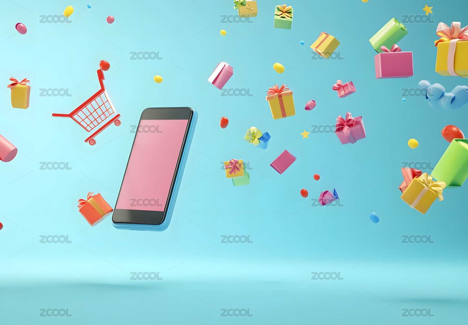 手机,购物,电商,促销,卡通,气球,礼物,购物车,粉色,背景