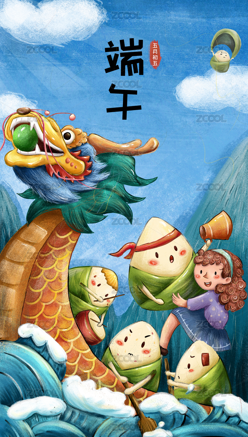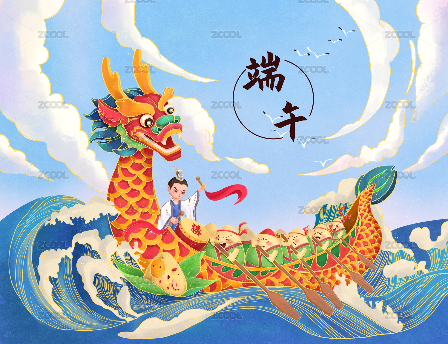 中国端午节龙舟粽子雄黄酒国风插画大图