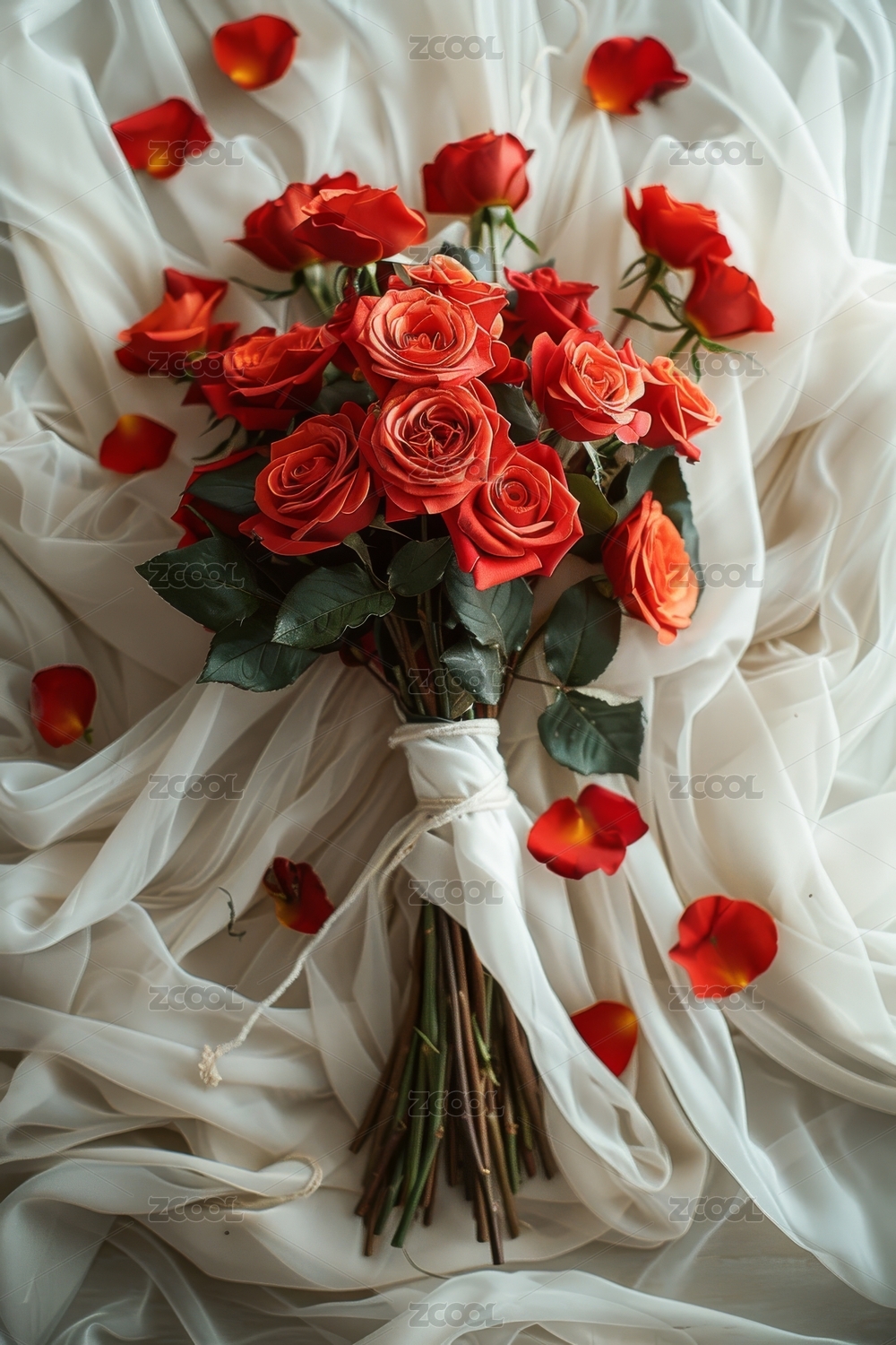 户外的椅子上放着一束红色手捧花,唯美鲜花