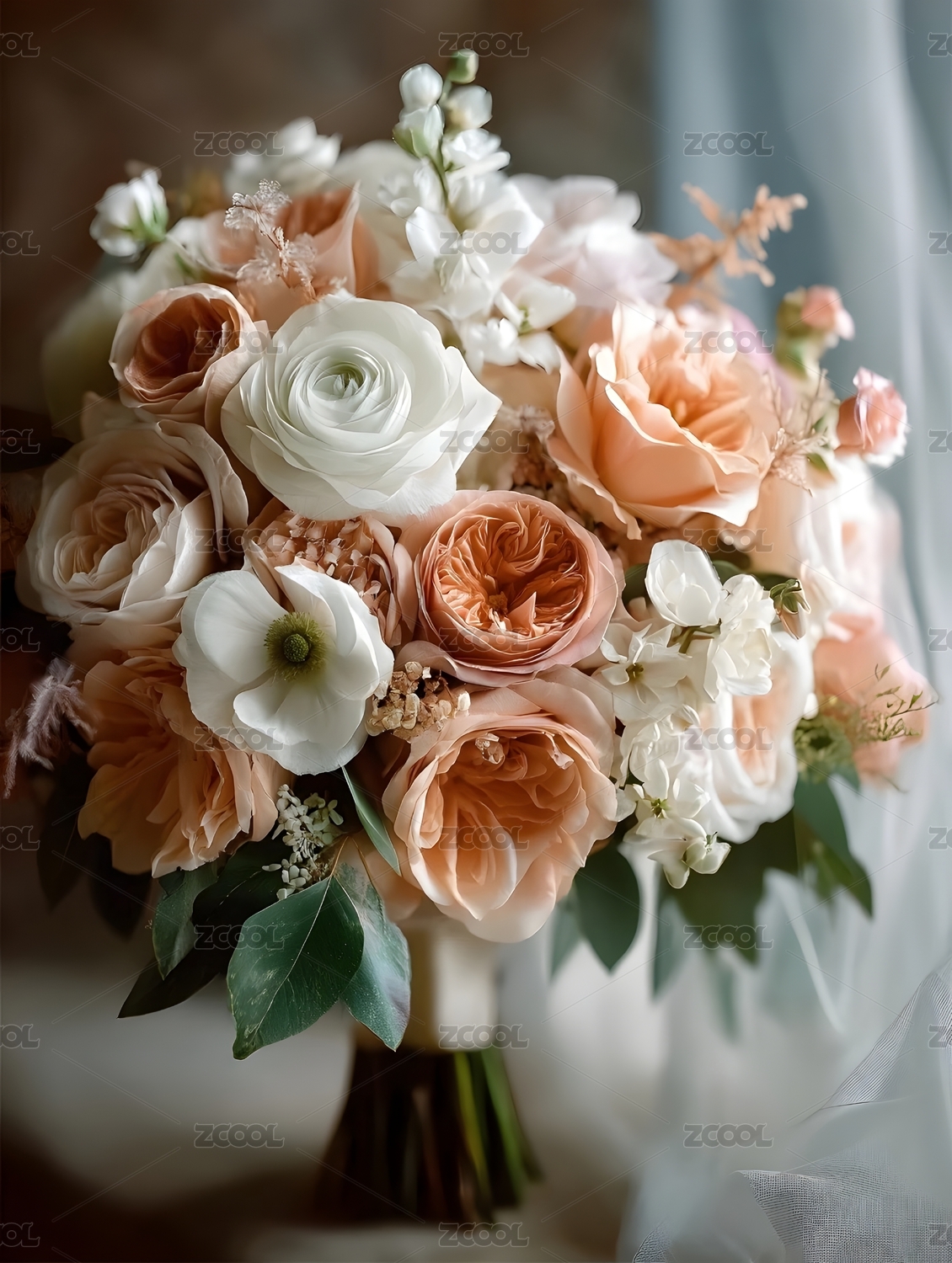 窗边沙发上放着一束手捧花,唯美鲜花。
