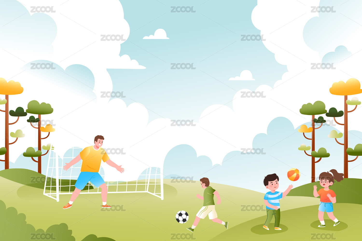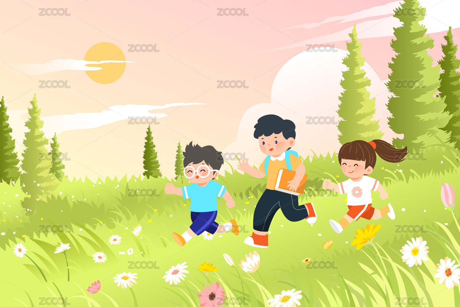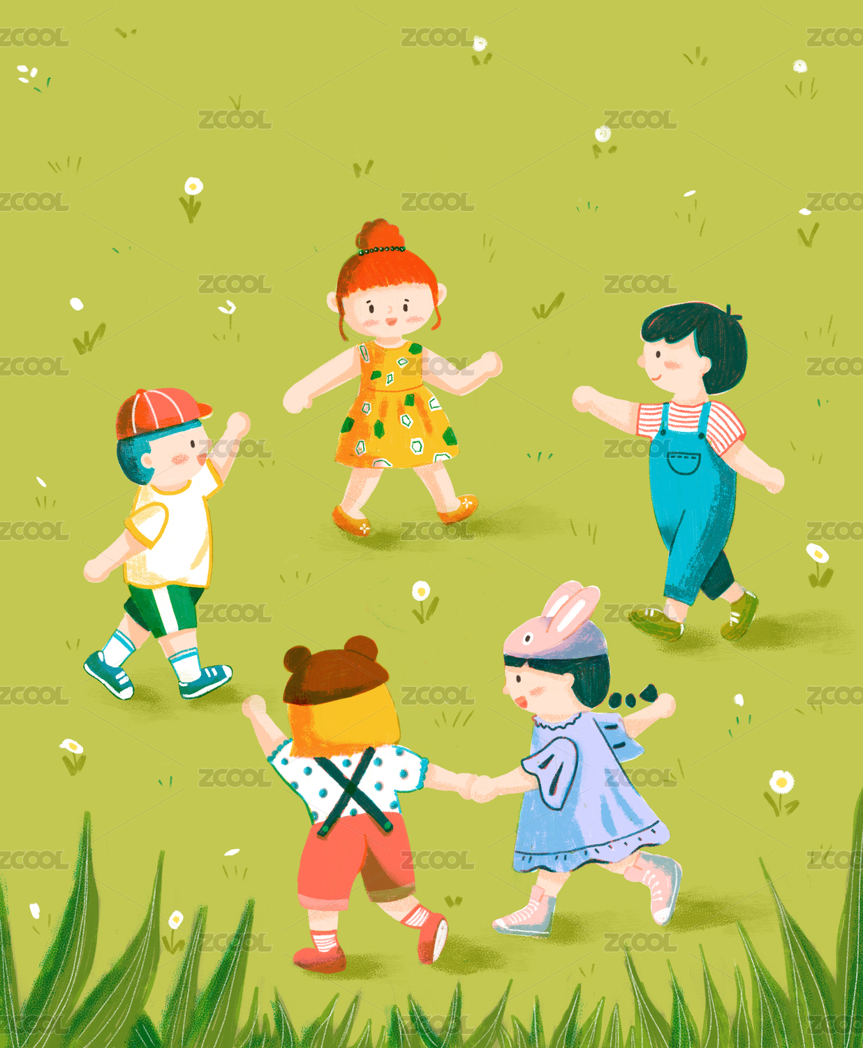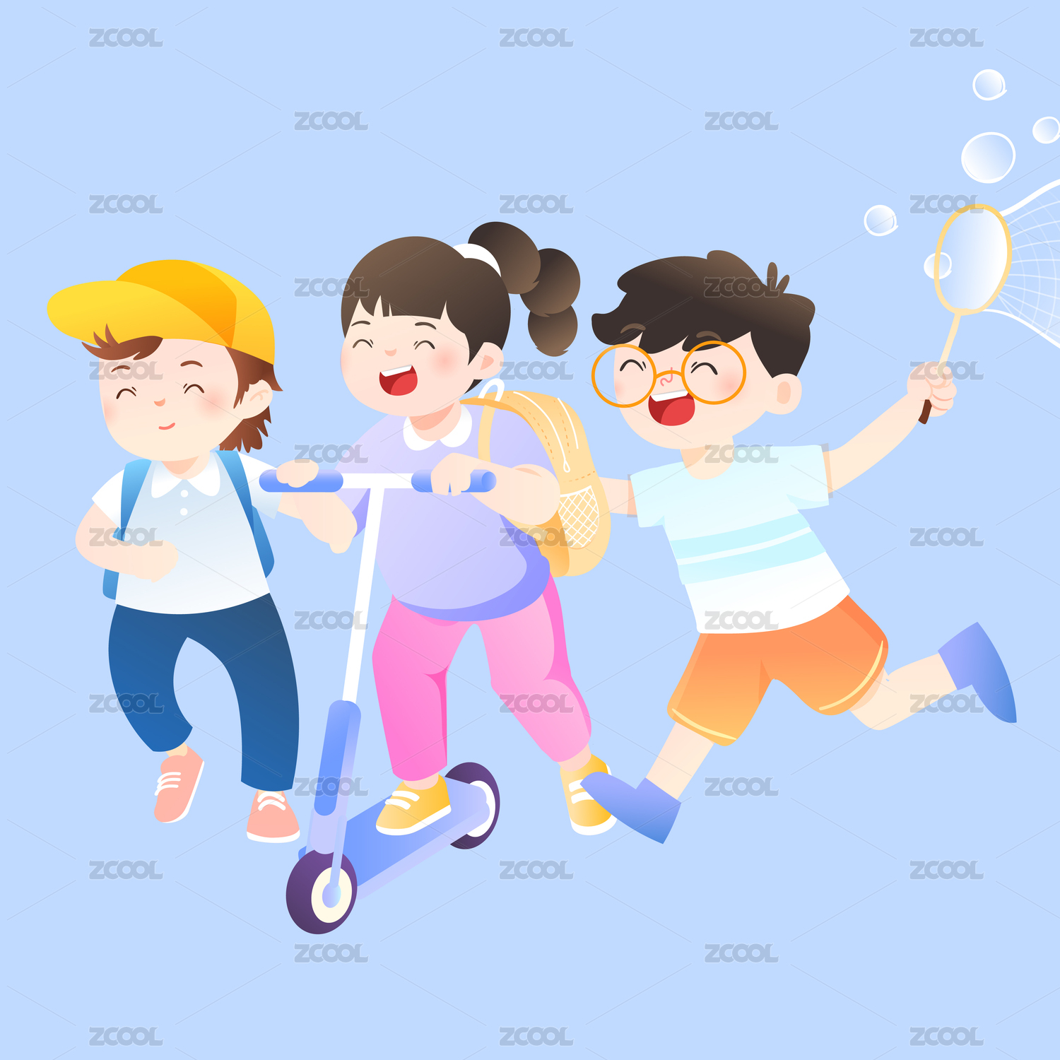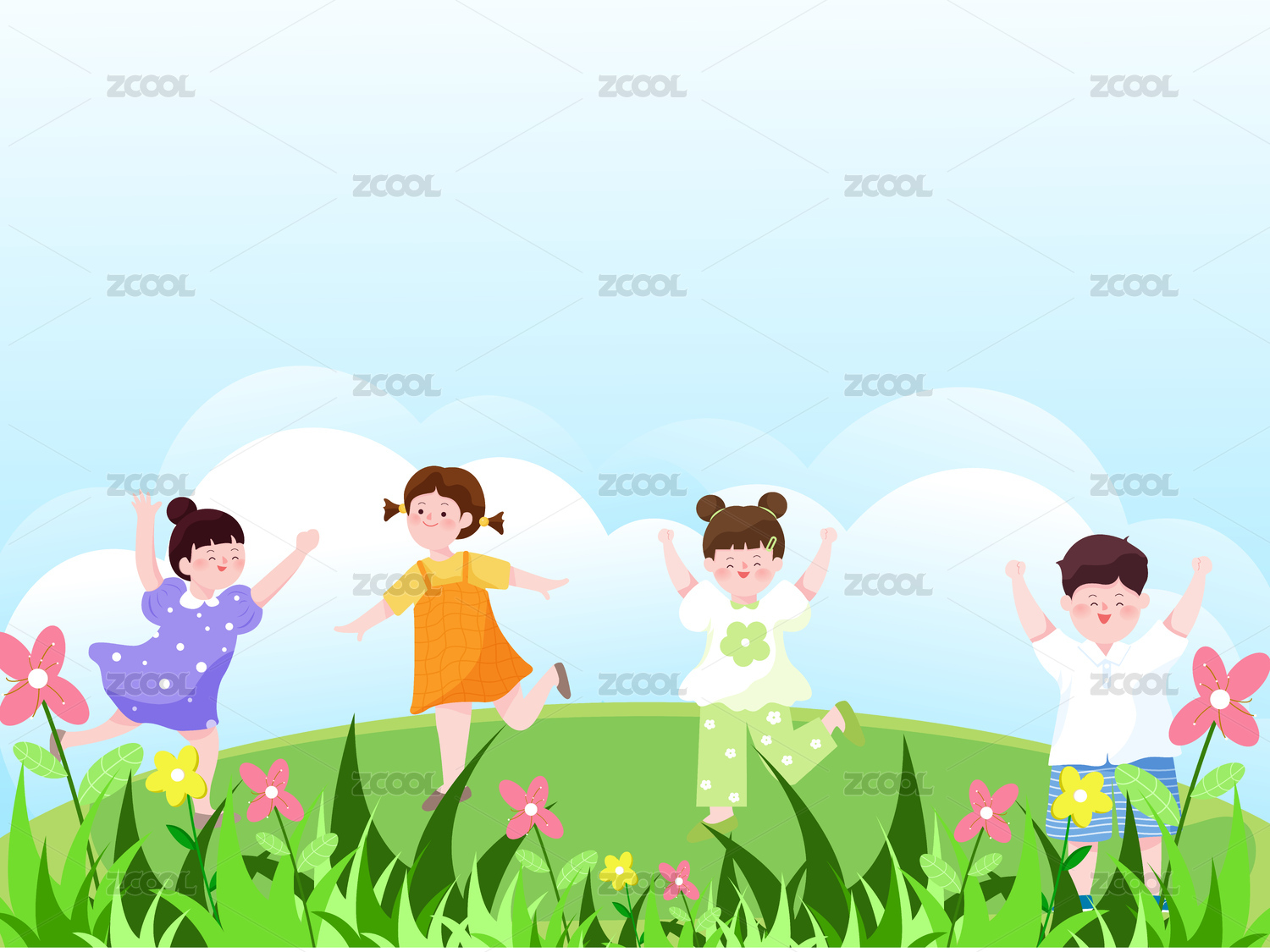 可爱卡通六一儿童节在草地上玩耍的小朋友们