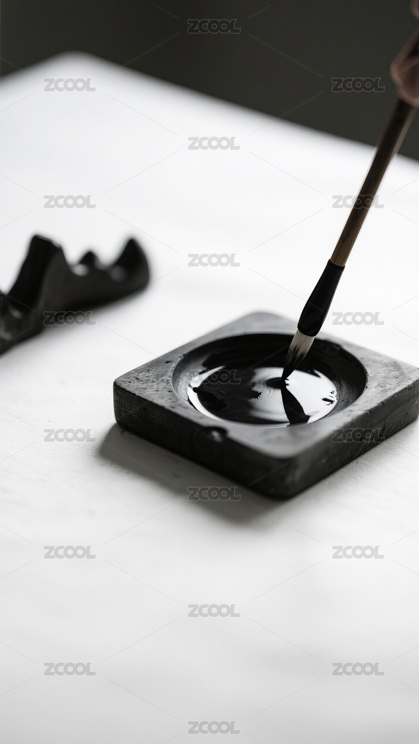 毛笔与墨盘静物特写