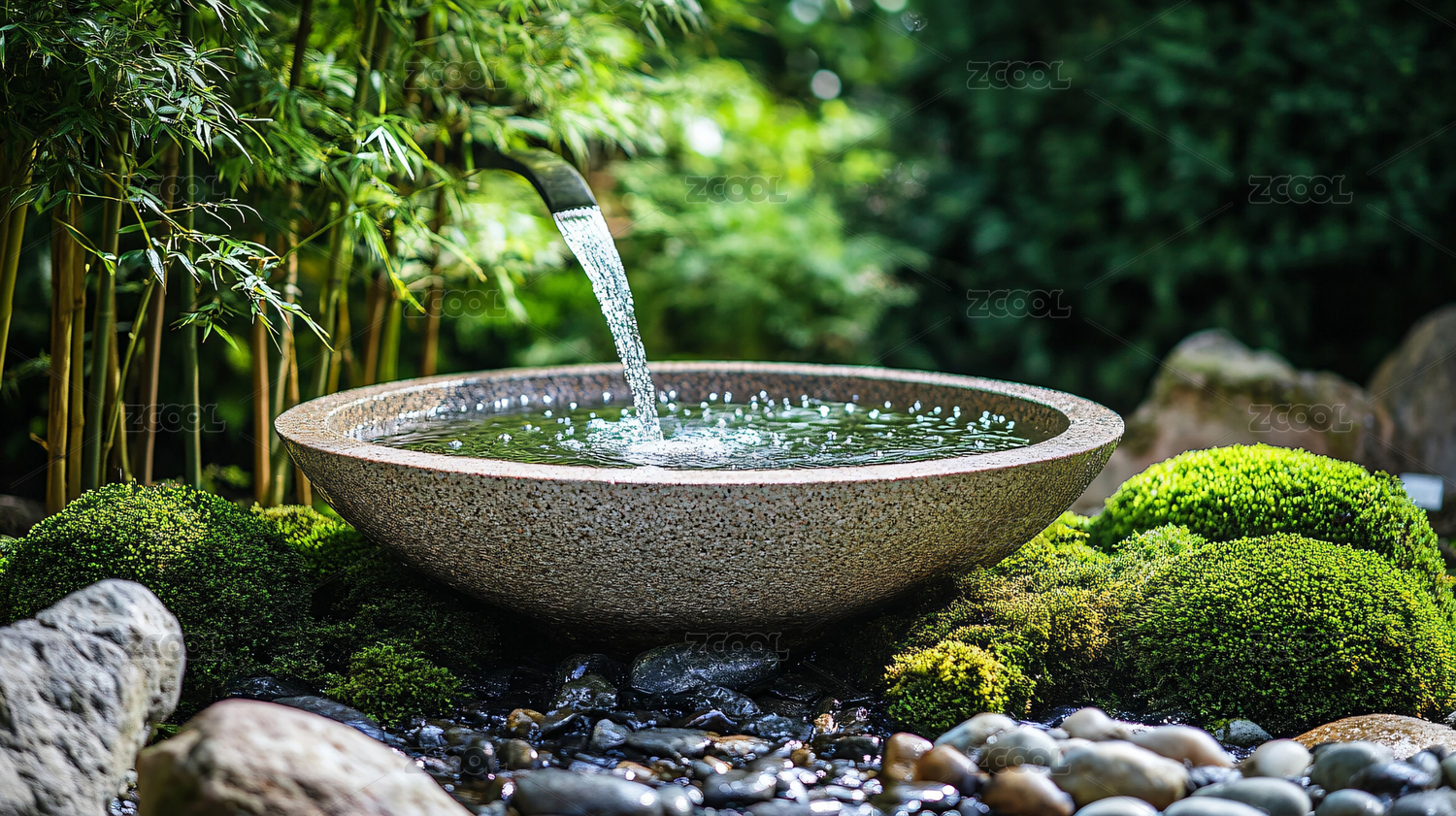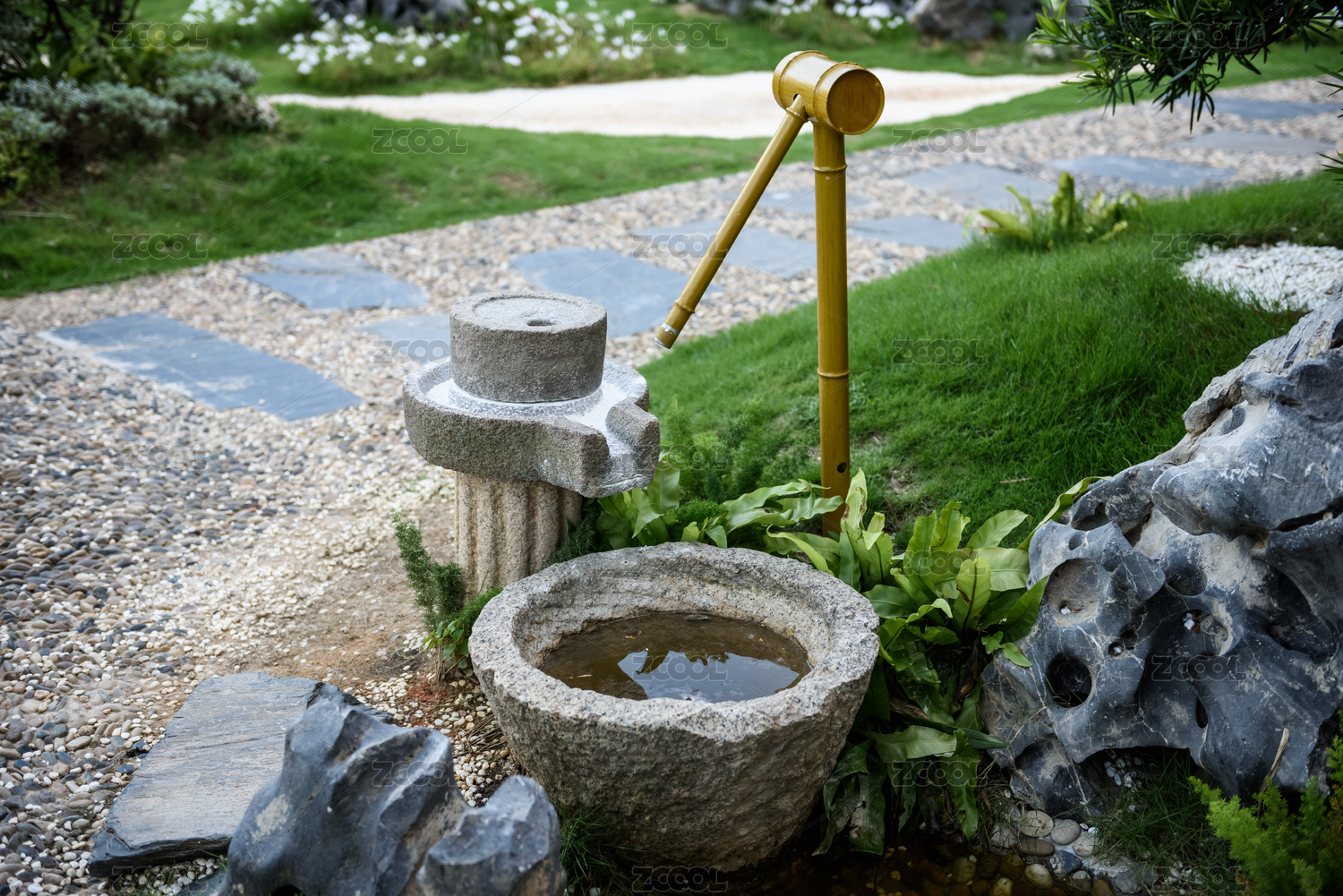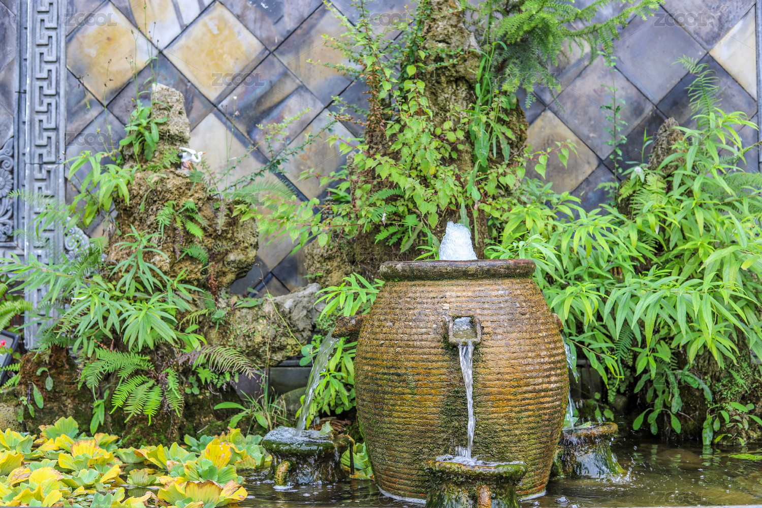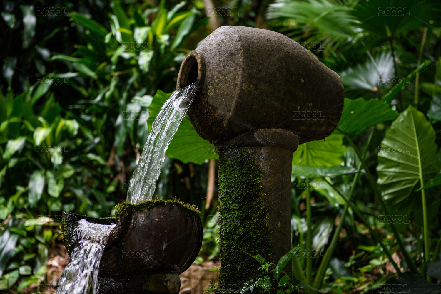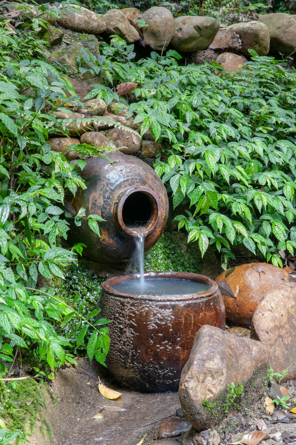 中国城市园林特色景观-竹筒清泉流水装置特写