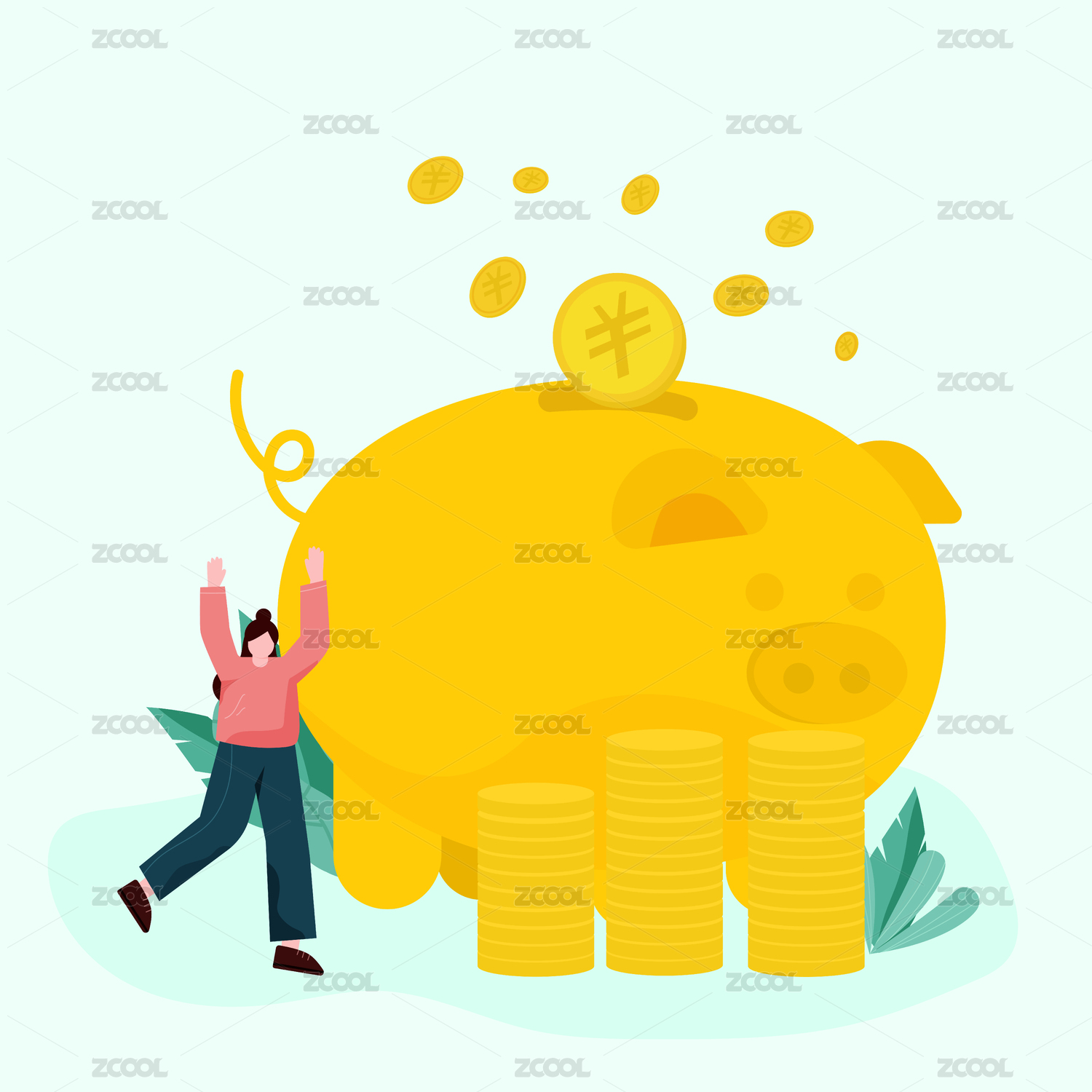 卡通手绘卡通女生拿金币存钱插画