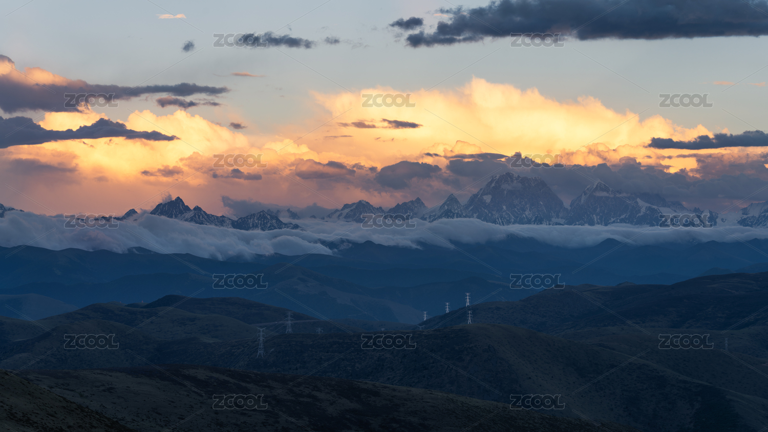 中国四川新都桥高原地区夕阳雪山与高压电塔