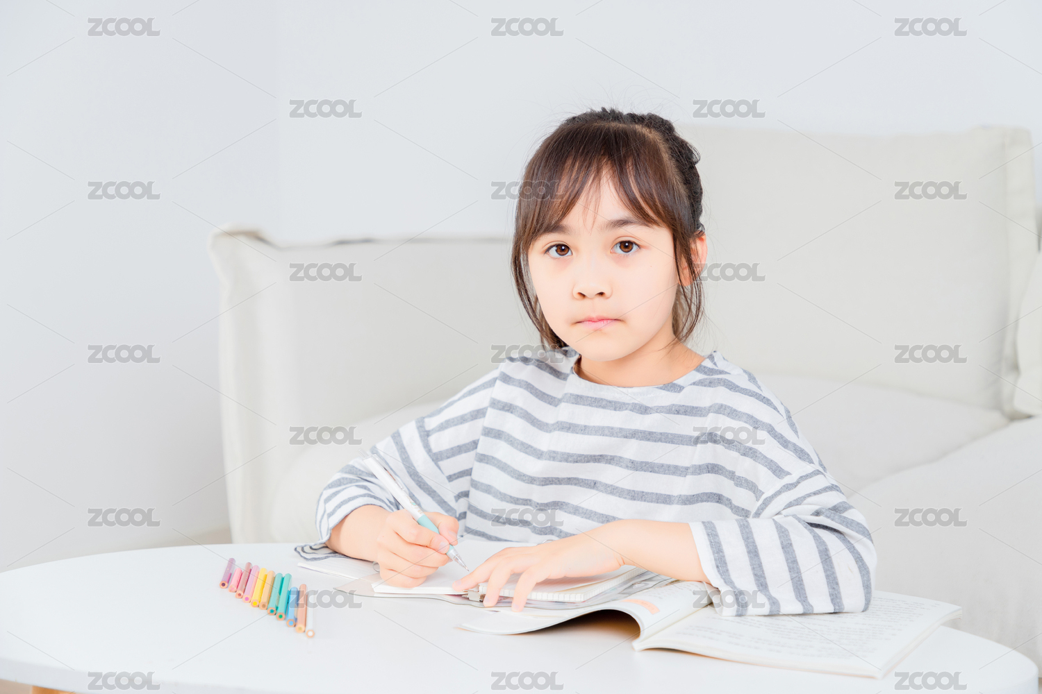 趴在地毯上写字的亚洲小女孩