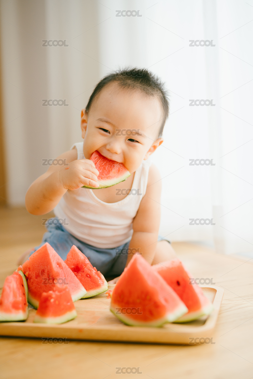 穿着白色背心的中国宝宝在开心的吃西瓜