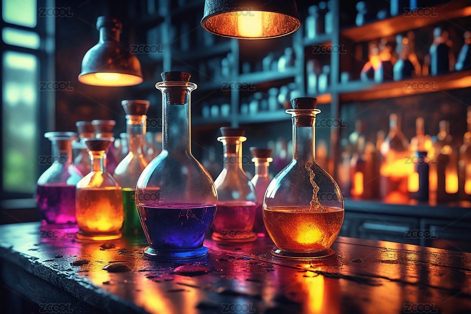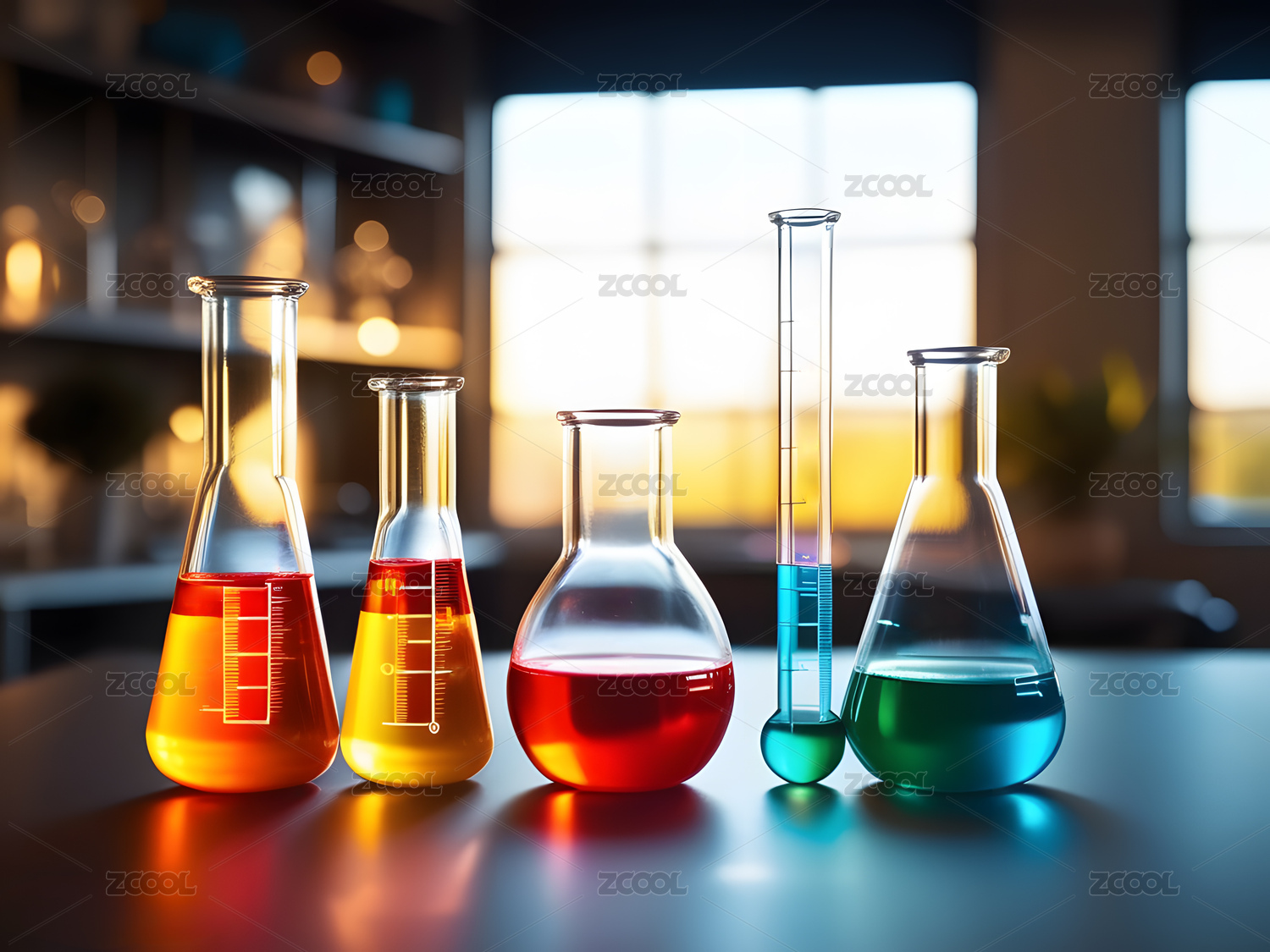 实验室中色彩缤纷的化学烧瓶
