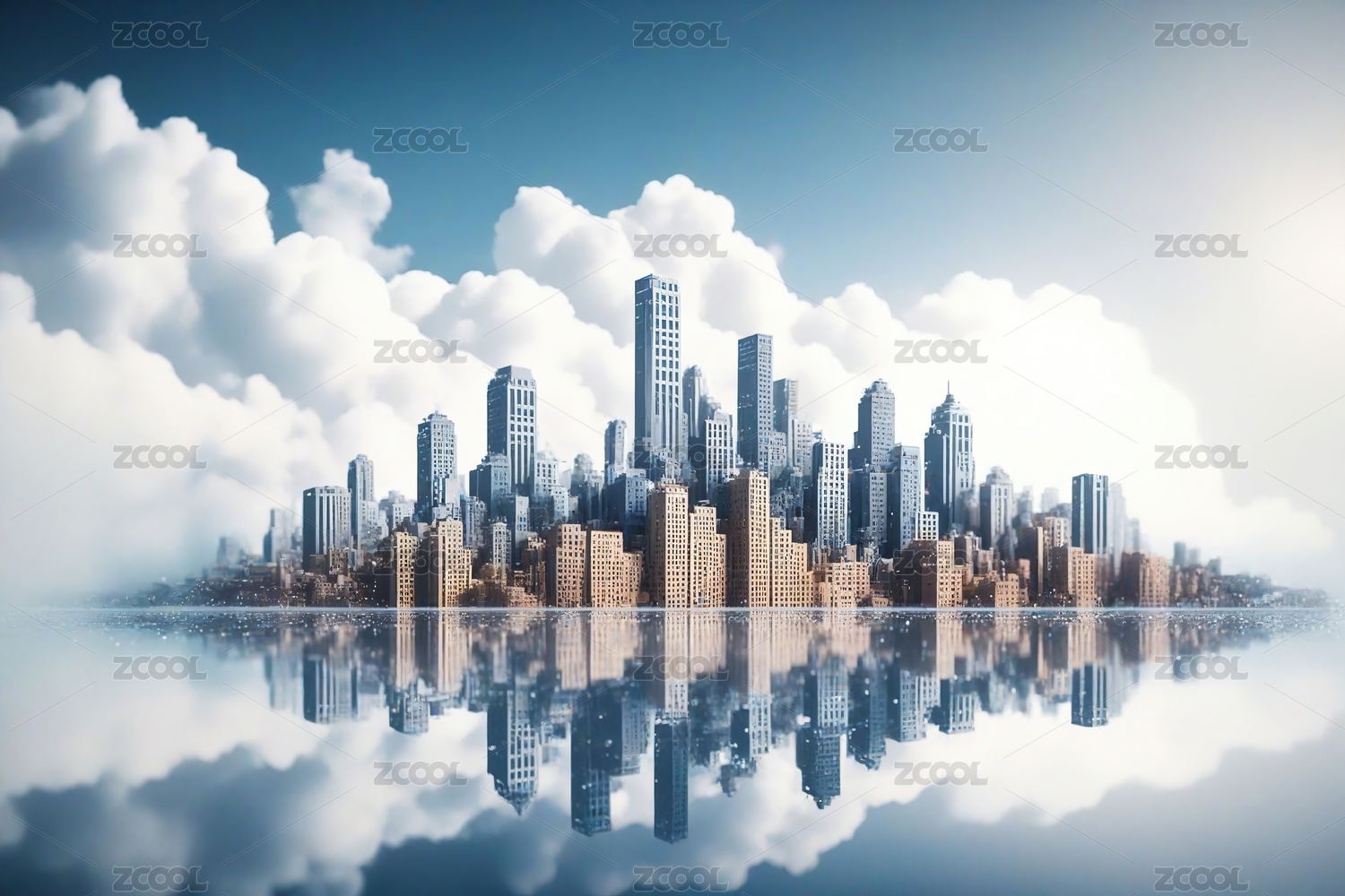浮空,岛屿,城市,建筑,摩天大楼,天空,云朵,反射,水面,光线
