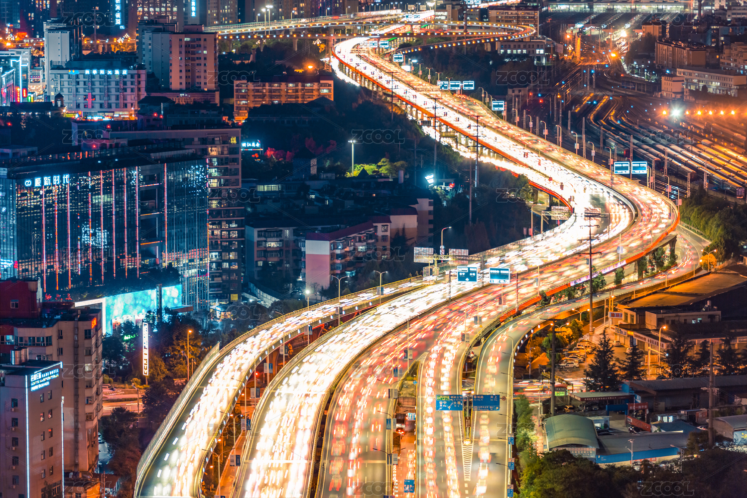 在现代中国城市夜间城市交通图。