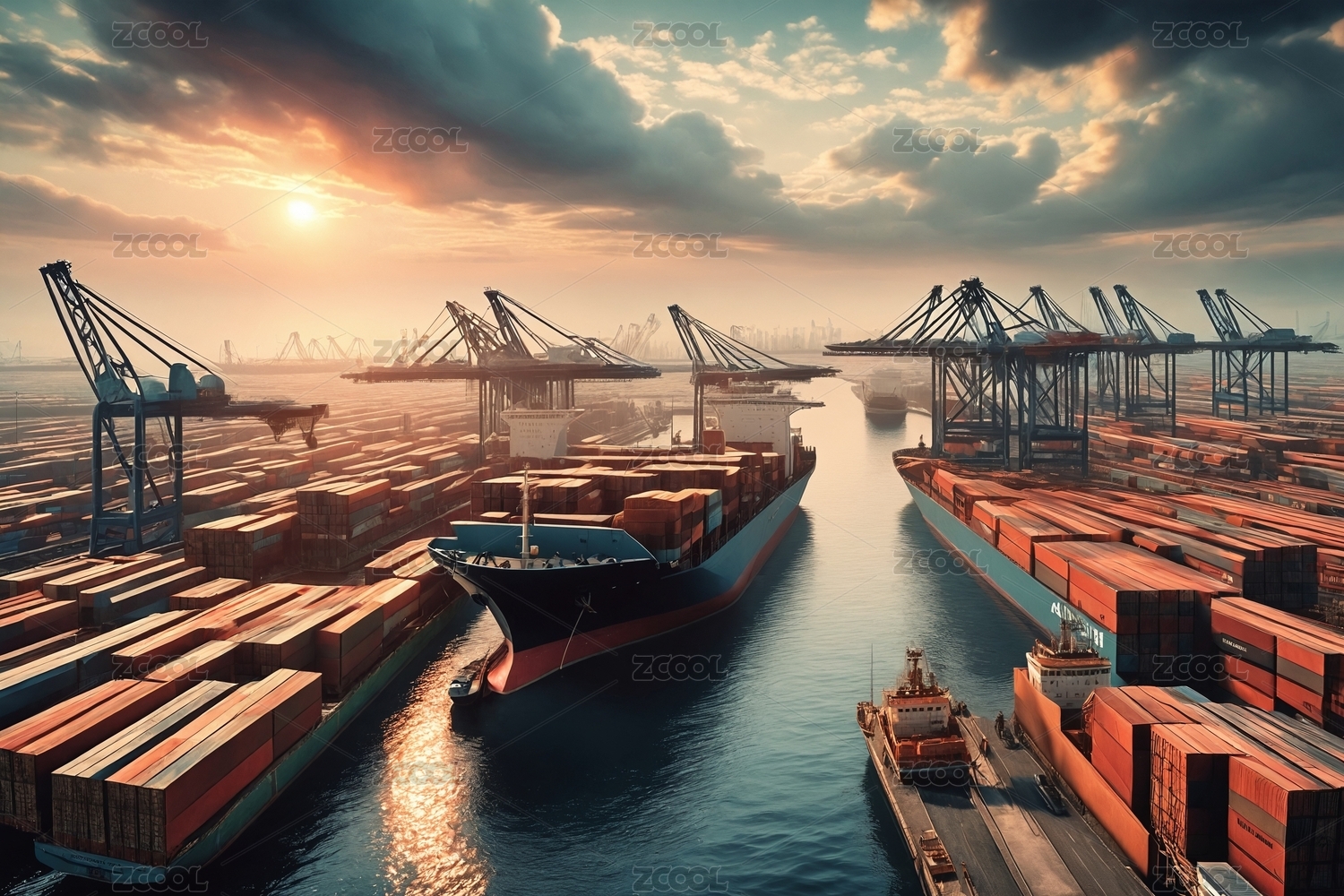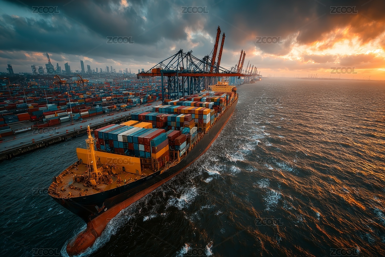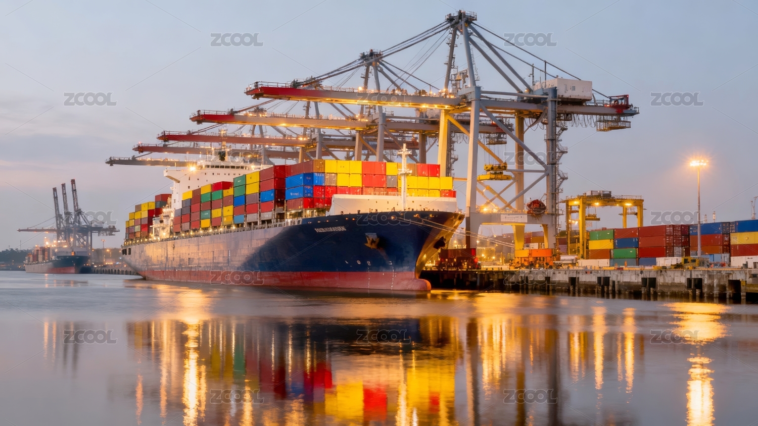 黄昏,港口,货轮,集装箱,海水,天空,云朵,光线,色彩,建筑