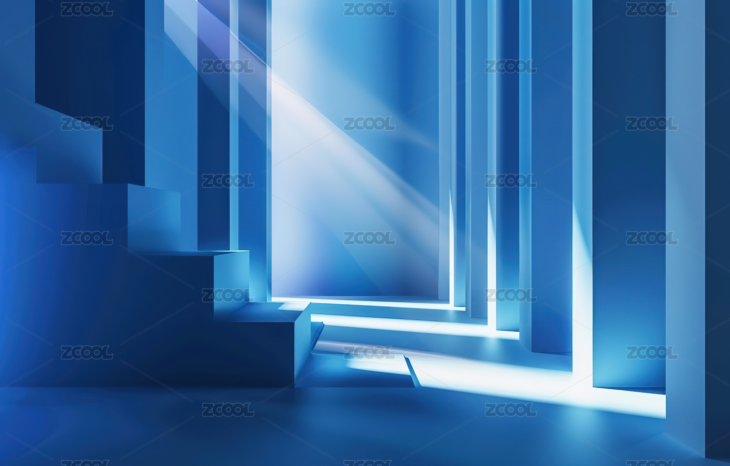 三维渲染的蓝色方形几何体走廊灯光展台背景