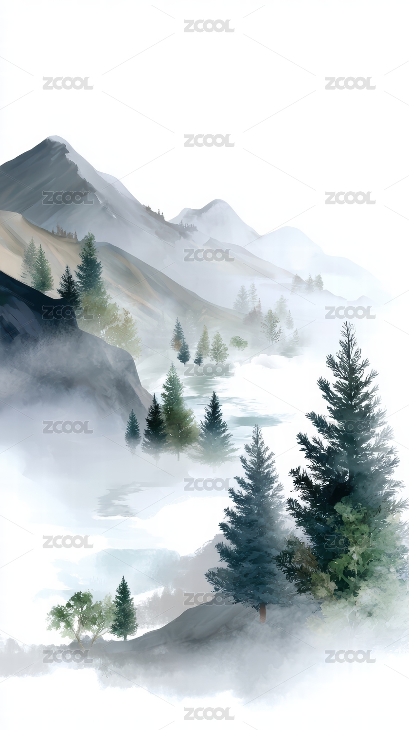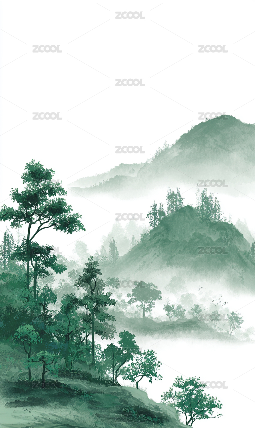 蓝绿色水墨树木抽象插画海报背景装饰画